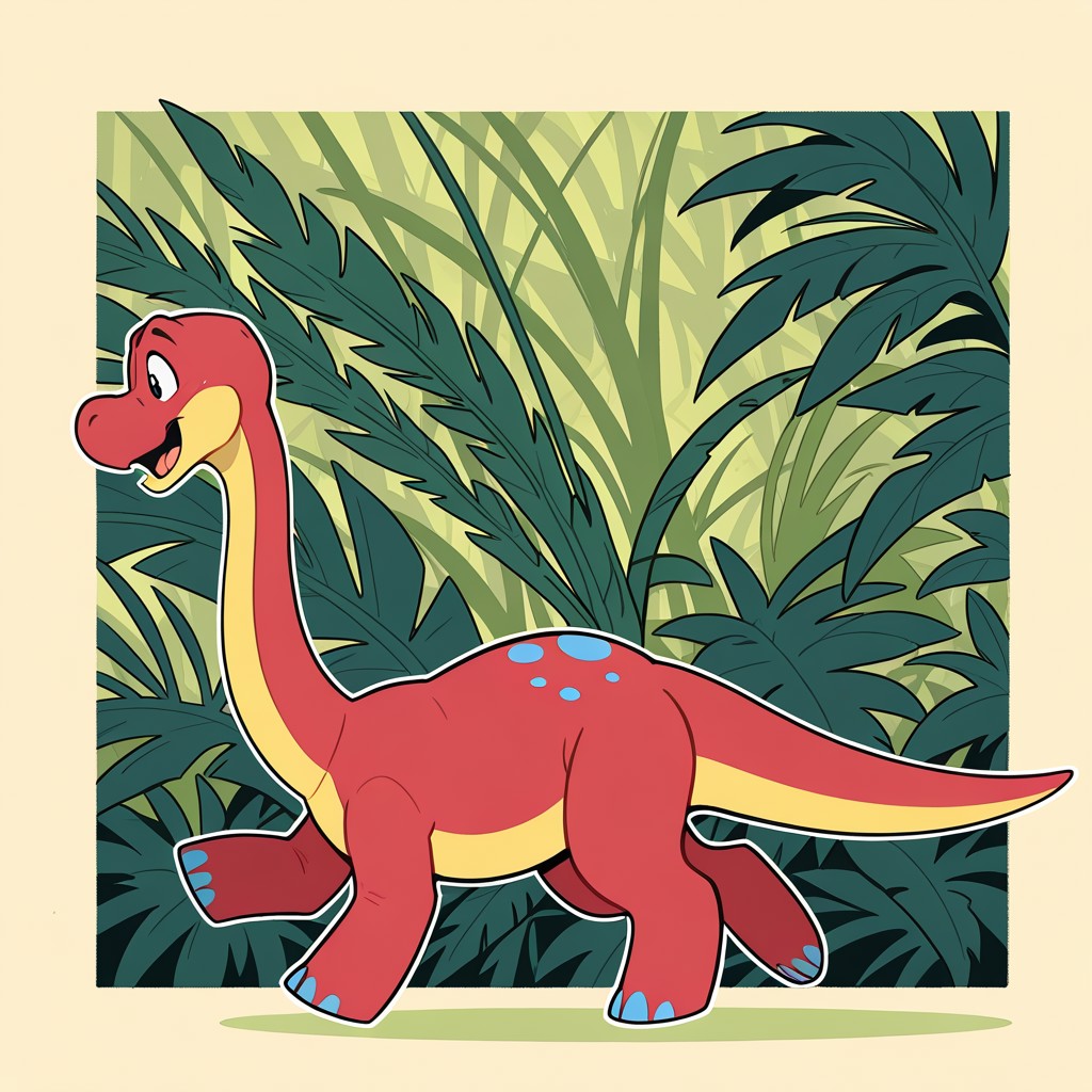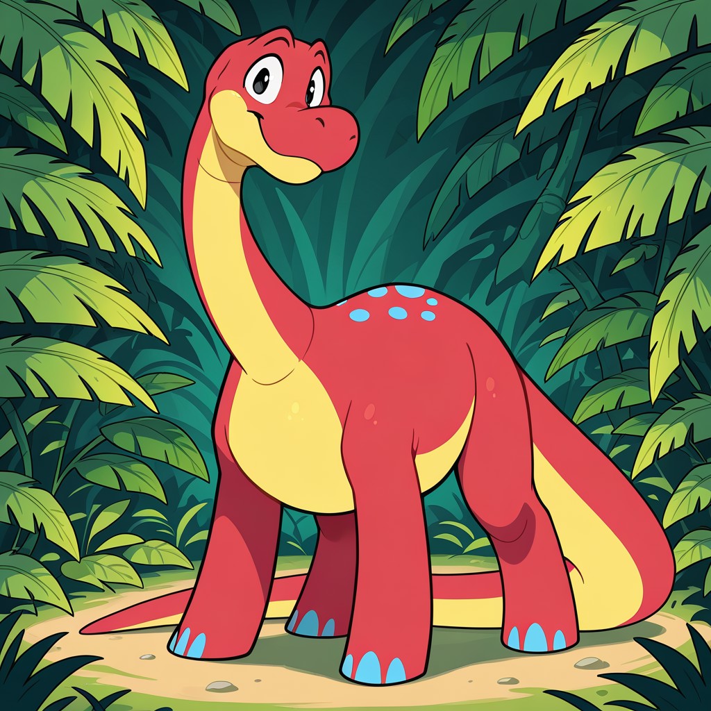 dinosaur, brontosaurus, red and yellow skin, black eyes, long neck, blue spots, long tail,