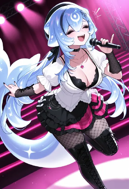 1girl, bao \(vtuber\), whale girl, fish tail, fins, red eyes, pale skin, sharp teeth, large breasts, medium breasts, collarbone, cleavage, blue hair, light blue hair, streaked hair, black hair, hair over one eye, hair between eyes, long hair, very long hair, nail polish, makeup, black eyeshadow, black bow, ribbon, black ribbon,