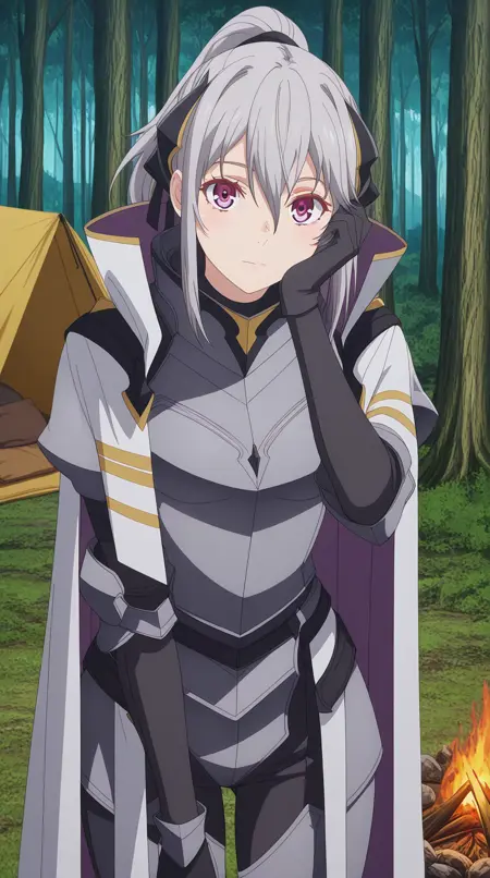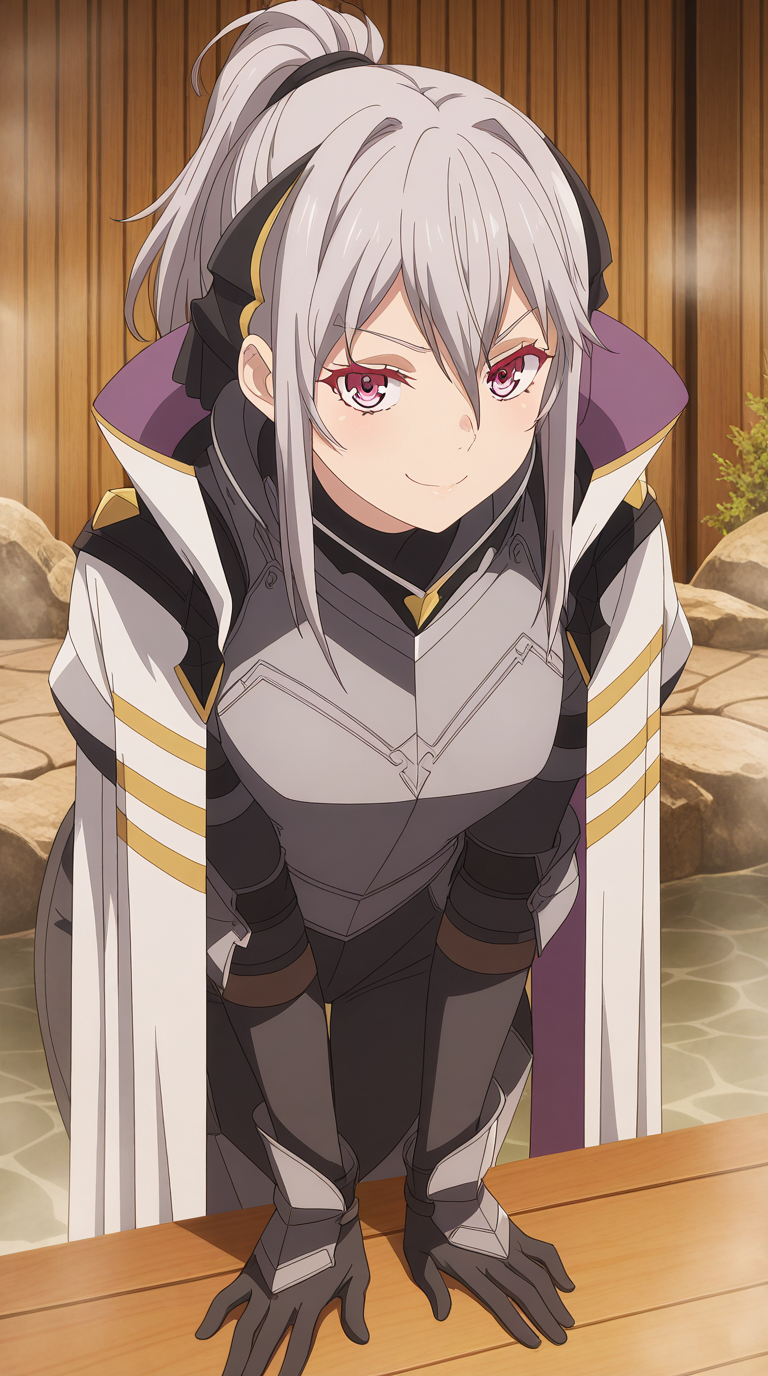 jeanne e anise, 앞머리, 보라색 눈, 꼬리머리, 머리 리본, 검은 리본, 눈 사이의 머리카락, 회색 머리, 악마 소녀, 성숙한 여자, 중간 크기의 가슴, 애니메이션 스크린캡