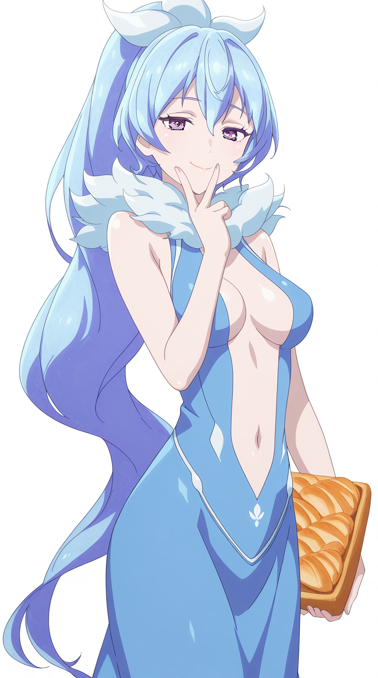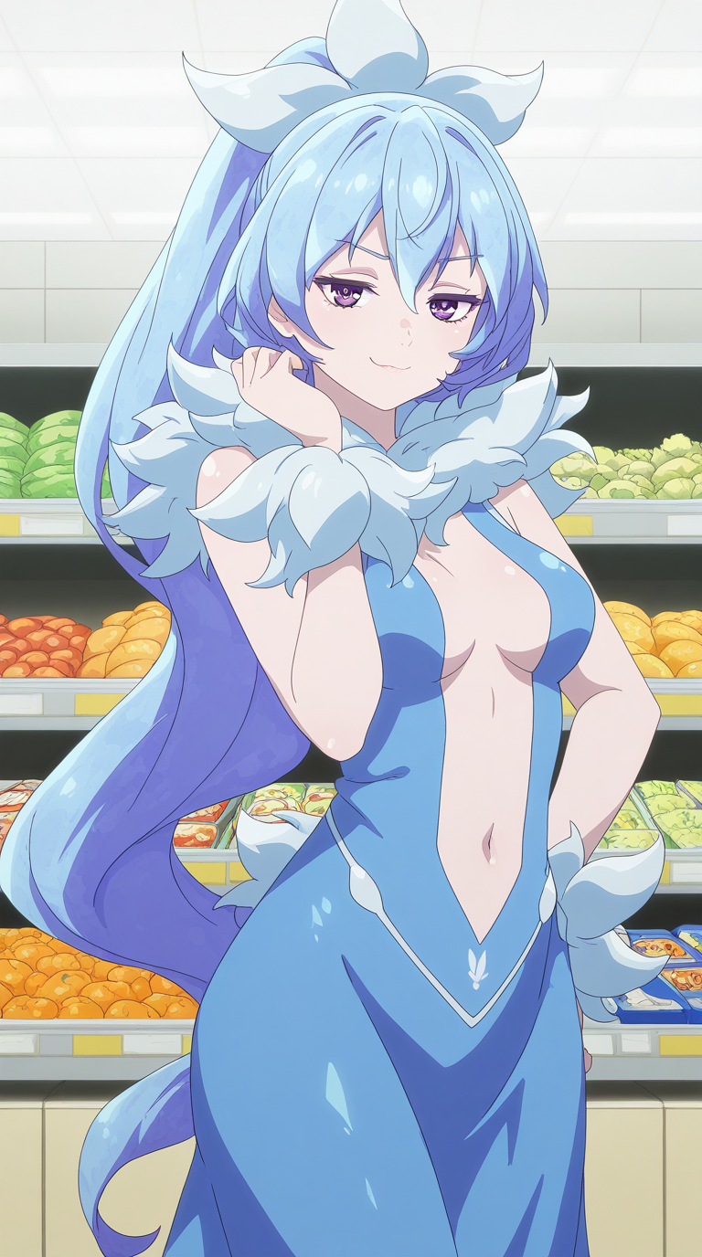드레스, 파란 드레스, 중앙 열림, 어깨 노출, 복부, 배꼽, 털 장식