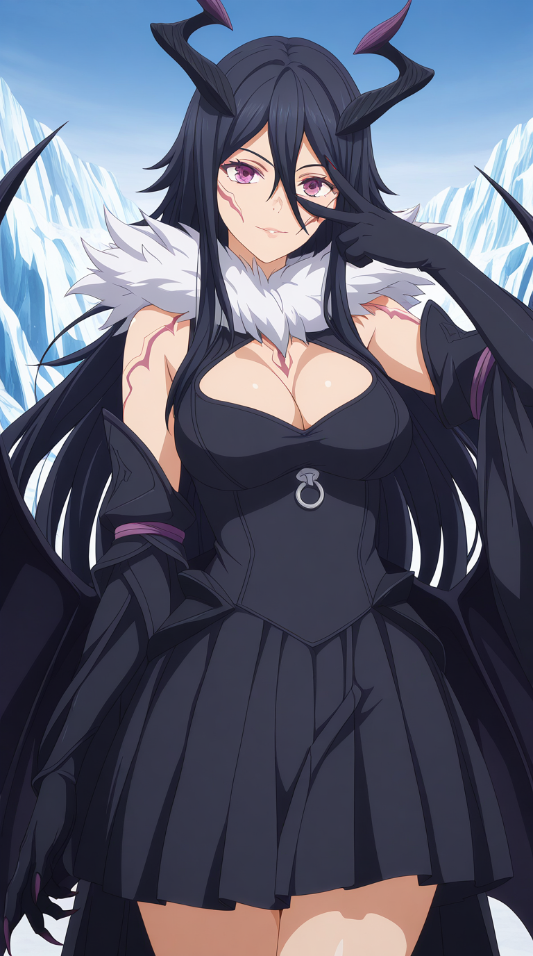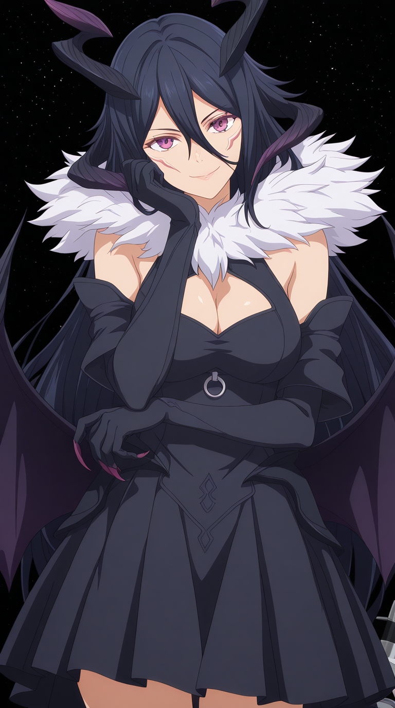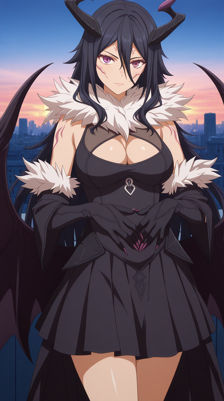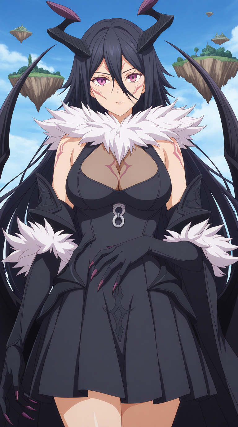 vanessa, 검은 머리, 보라색 눈, 뿔, 얼굴 무늬, 눈 사이 머리, 긴 머리, 성숙한 여자, 중간 크기 가슴, 애니메이션 스크린캡
