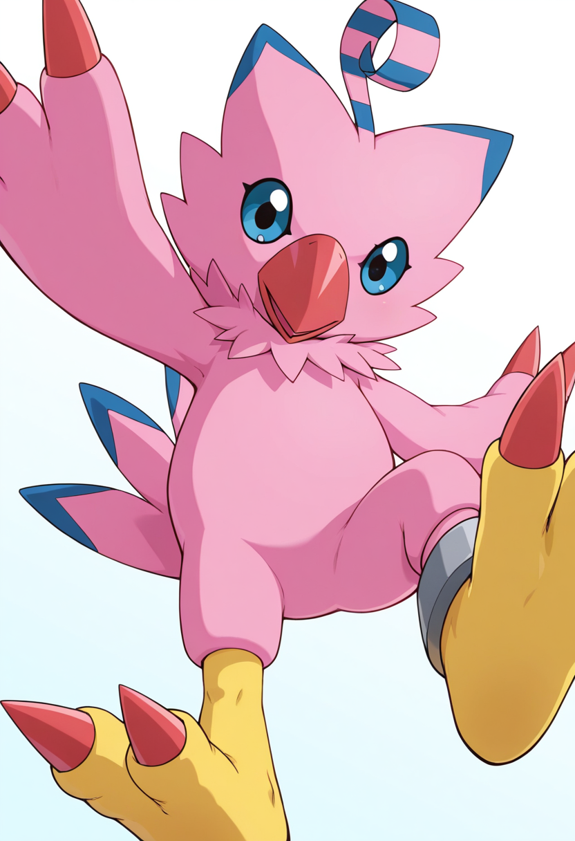 프롬프트: piyomon, 분홍색 깃털, 부리, 파란 눈, 노란 발톱, 털이 많음, 발목 고리, 치비 몸체,