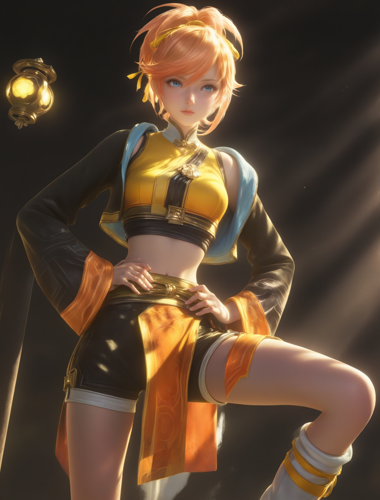 프롬프트: jixiaoman, blonde hair, lips, ponytail, blue eyes, breasts, hair ribbon, yellow ribbon, orange hair, swept bangs, ponytail, pink lips, hair between eyes,