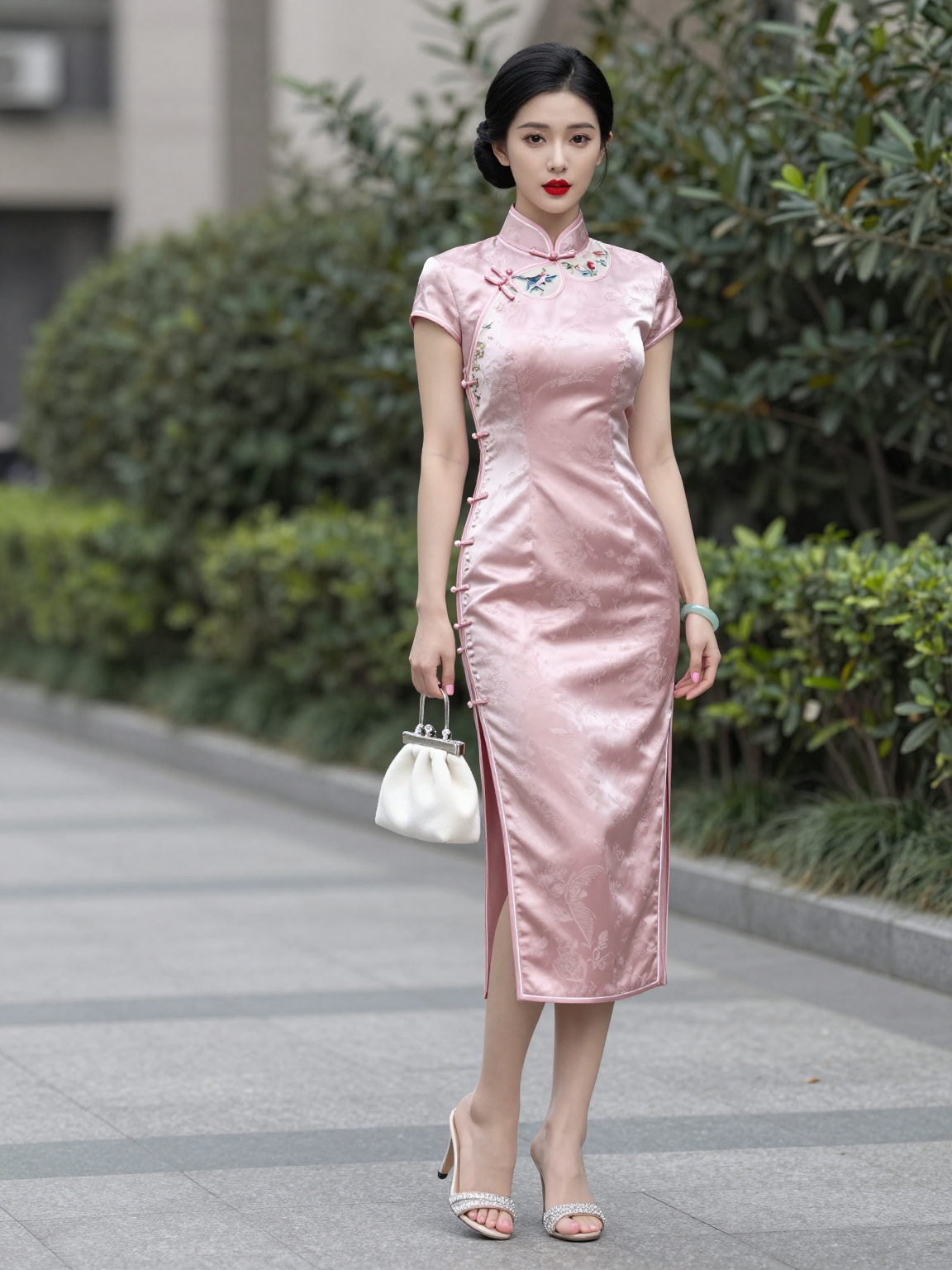 明確で整った顔の輪郭、はっきりとした眉と目、まっすぐな鼻筋、そしてふっくらとした赤みを帯びた唇を持つ東アジア系の女性。化粧は繊細で上品です。髪は黒く、厚く、きっちりと後ろで低めの結い上げ髪型にまとめられており、細い首を際立たせています。彼女の体格は優れており、平均的な身長で、スリムな体型と滑らかなラインを持ち、胸元はしっかりとした丸みを帯びています。彼女は、立ち襟と斜めの前開き、短い袖、胸元に花と鳥のモチーフを描いた三つの円形刺繍パッチが施されたピンク色の改良型チョンサムを着ています。刺繍は豊かで繊細な色合いです。チョンサムの前面には腰線から膝上約5cmまで垂直にスリットが入っており、生地は軽く、透け感があり、微妙なジャカード織りの質感を持ち、日光の下で柔らかな光沢を放ちます。右手には白いベルベット製のポーチが付いた小さなシルバー製のクラッチバッグを持ち、左手首にはシンプルで上品な Jade のブレスレットを着用しています。足元は、軽いシャンパン色のクリスタルがちりばめられたハイヒールサンダルで、上部は空洞化され、小さなダイヤモンドで装飾され、かかとは太く頑丈で体重をしっかり支え、つま先の爪は丁寧に整えられ、薄いピンク色に塗られています。