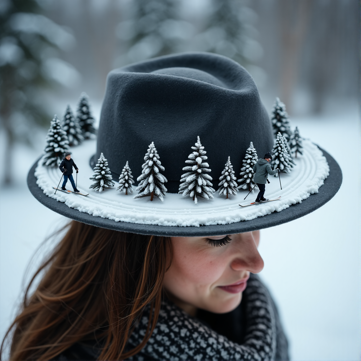 사진처럼 사실적인 [클로즈업, 고각] 사진으로, [인물 유형]이 [모자 유형]을 쓰고 있으며, 모자가 주된 주제입니다. 왕관은 그대로 유지되고, 끝 부분에는 왕관 바닥에서 외부 끝까지 완전한 링을 형성하며 살아있는 미니어처 세계가 가득 차 있습니다. 끝 부분 장면은 [장면 설명]을 묘사합니다.