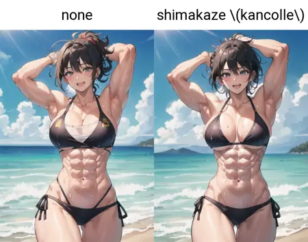 참고: 허리 주변에 예상치 못한 비키니 스트링이 보일 경우, 부정 프롬프트에 "shimakaze \(kancolle\)" 또는 "high leg"를 추가하면 제거되는 경우가 있습니다.