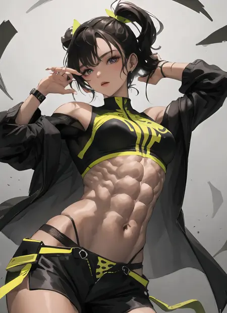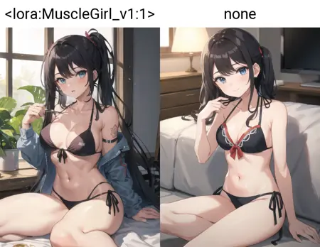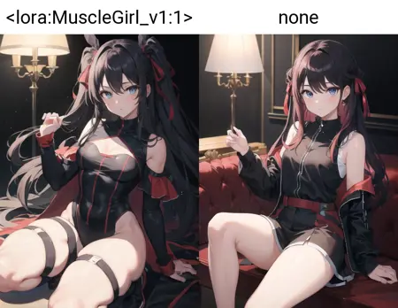 이 LoRA는 근육질 여성 생성, 근육 질감 향상, 허벅지 강화, 근육이 드러나는 타이트한 옷 이미지 생성에 도움을 줍니다.