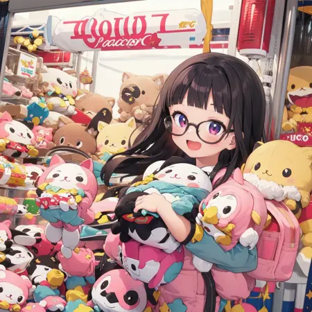 Prompt: UFOCatcher, scenery, still life, character doll, Claw machine,