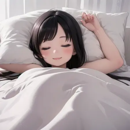 Prompt1: futon, closed eyes, pillow, sleeping, lying, bed, blanket, smile, on side, under covers, lips, indoors,