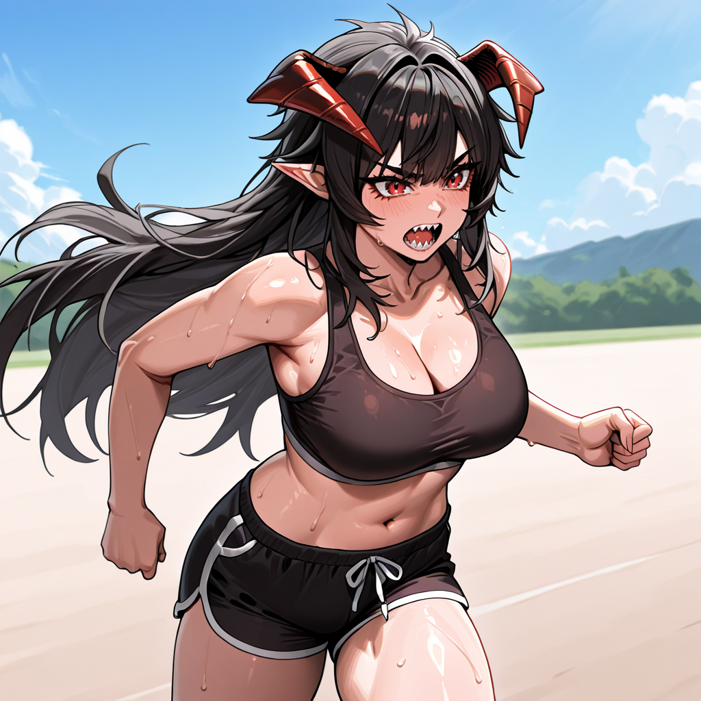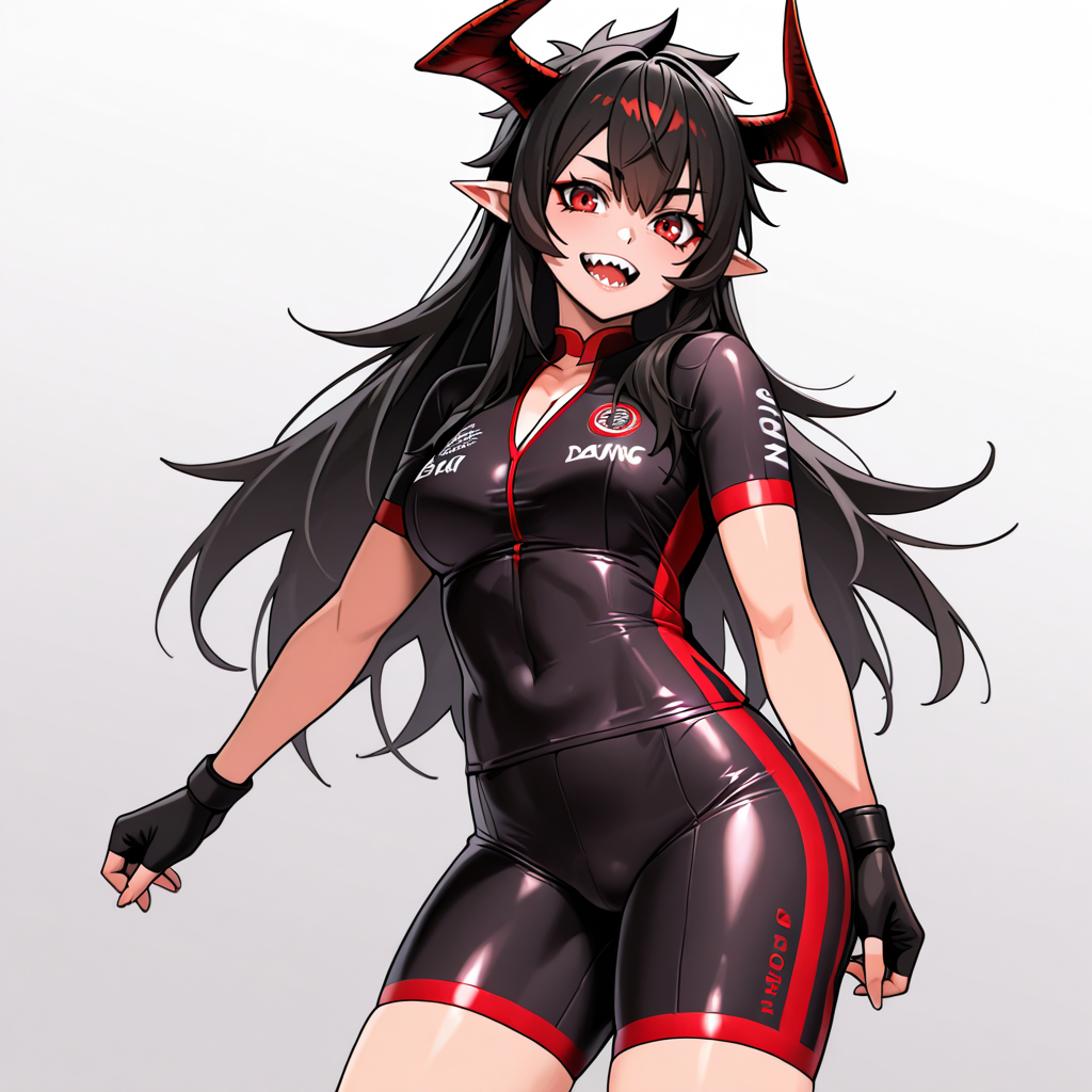 - トリガー:DemonKing, 1girl, 悪魔の角, 赤い目, 肘まで手袋, 尖った耳, 長い髪, 肩出し, 衣装の切り抜き, 黒髪, 尖った歯, 指なし手袋, 胸元の切り抜き, 胸元のタトゥー, 腹出し, へそ, 顔のタトゥー, 袖なし, パンティーストッキング, 前髪, クロップトップ, スカート, 黒手袋, カウボーイショット