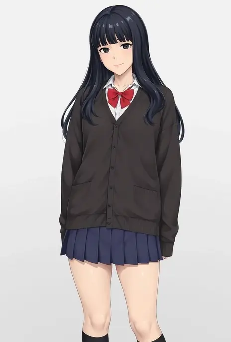 衣装: 学校制服、黒いカーディガン、長袖、白シャツ、襟付きシャツ、赤いリボンネクタイ、青いスカート、プリーツスカート、太もも、黒い膝上靴下