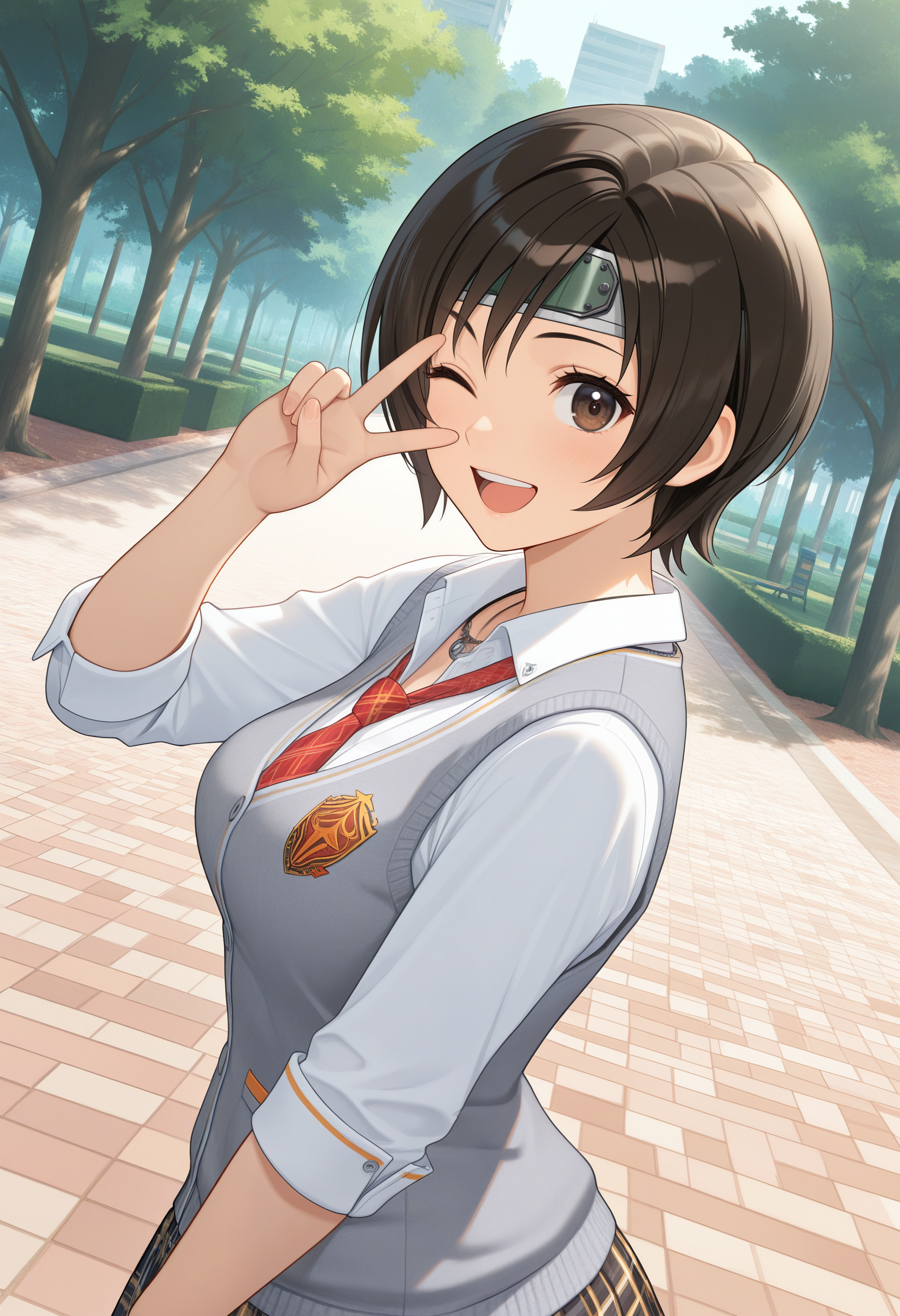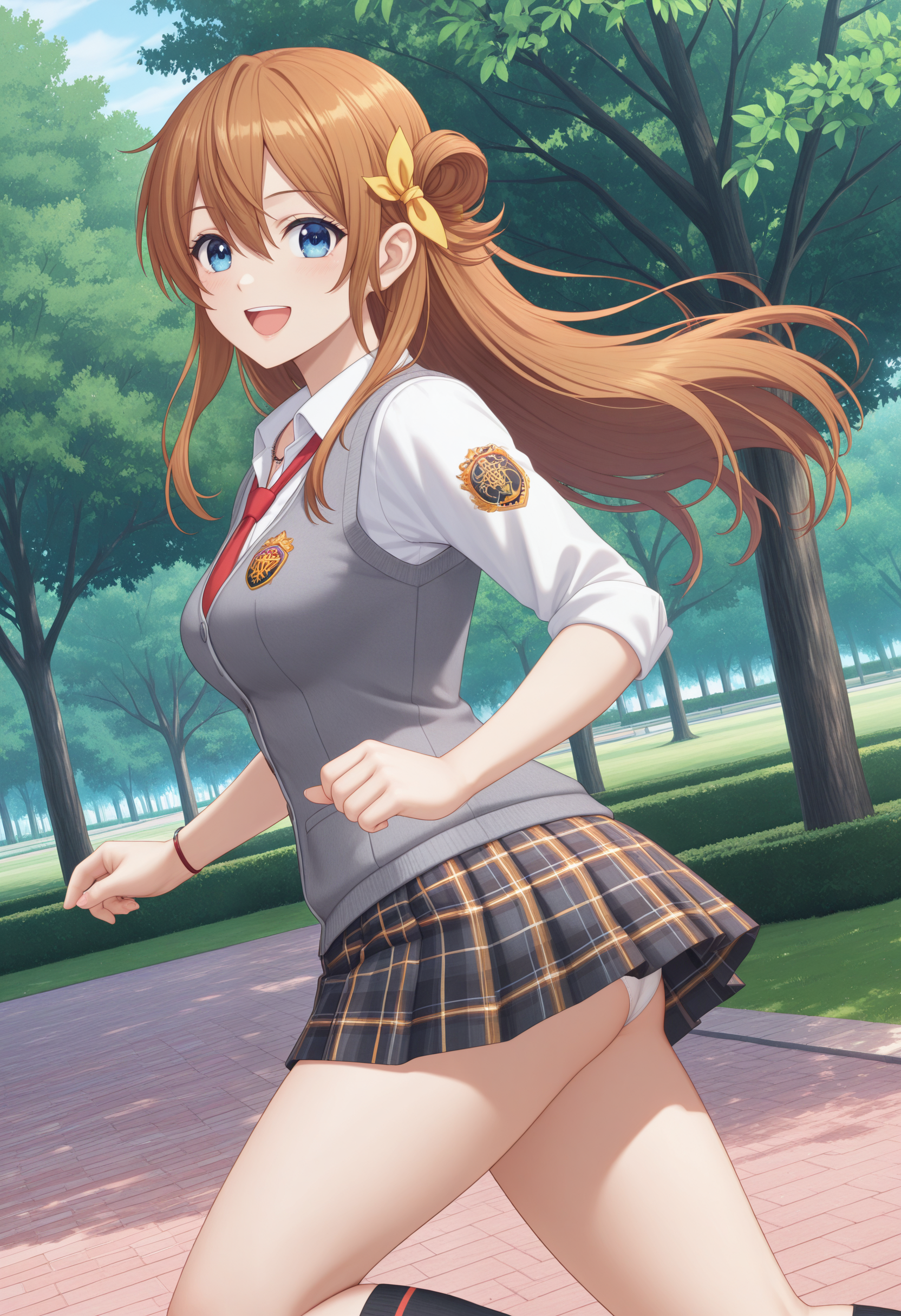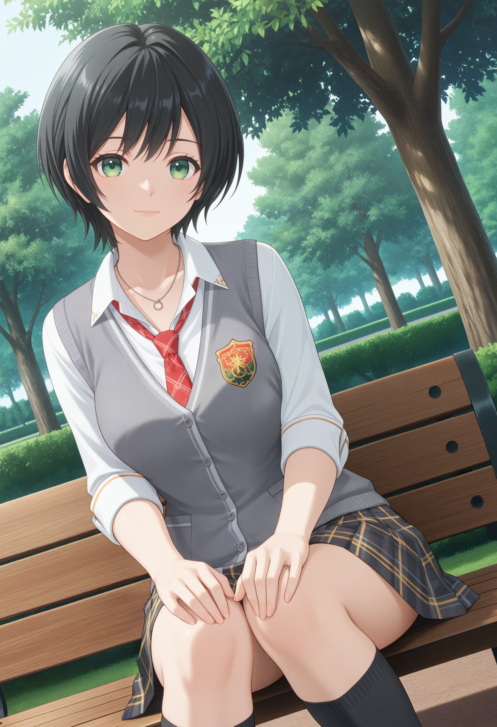 基本プロンプト:"school uniform,necklace,grey vest,emblem,red necktie,white shirt,sleeves rolled up,plaid skirt,black kneehighs,double yellow lines socks,loafers"