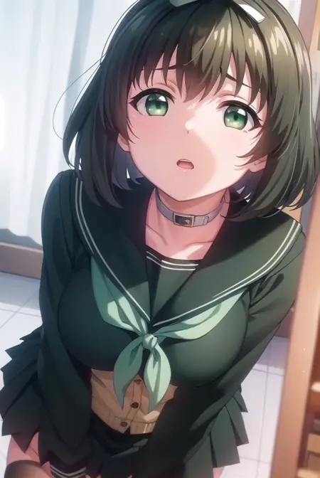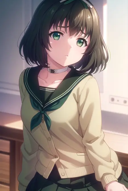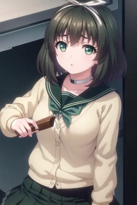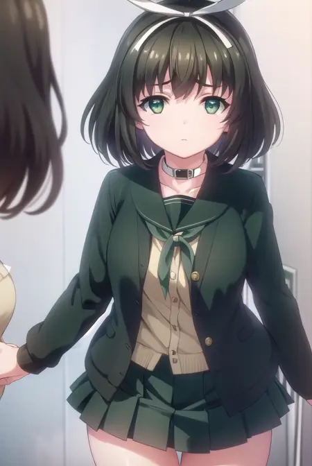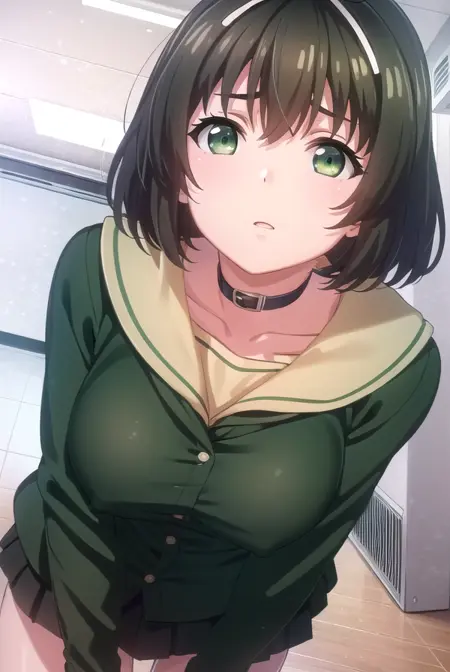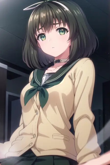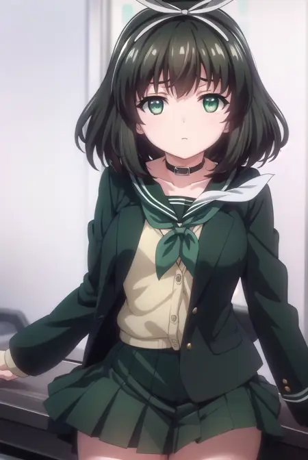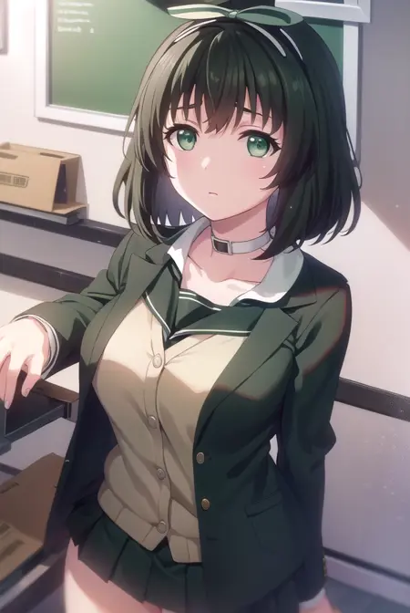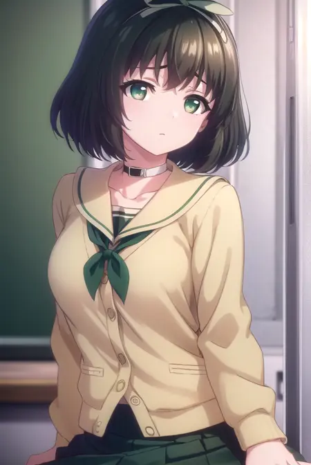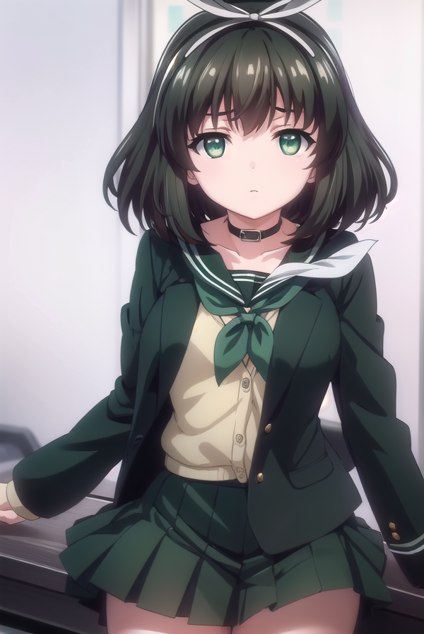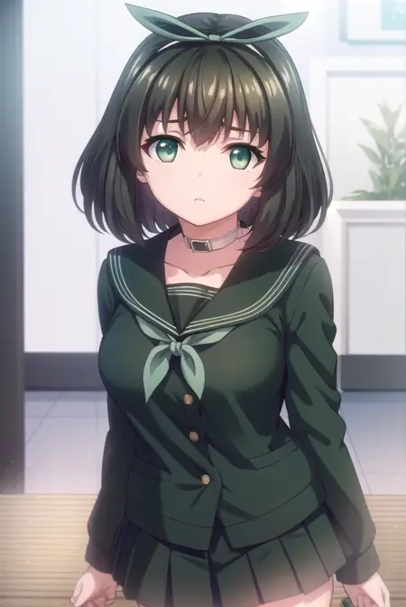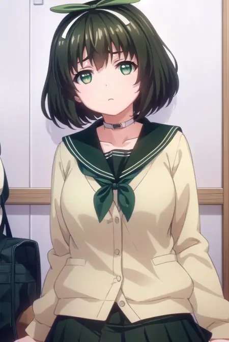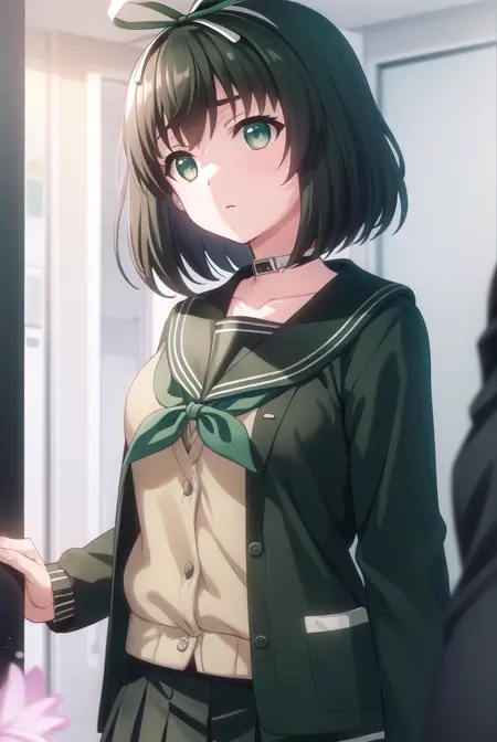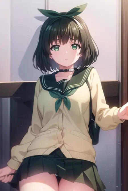 kanae hokari, short hair, black hair, ribbon, hair ribbon, (green eyes:1.5),