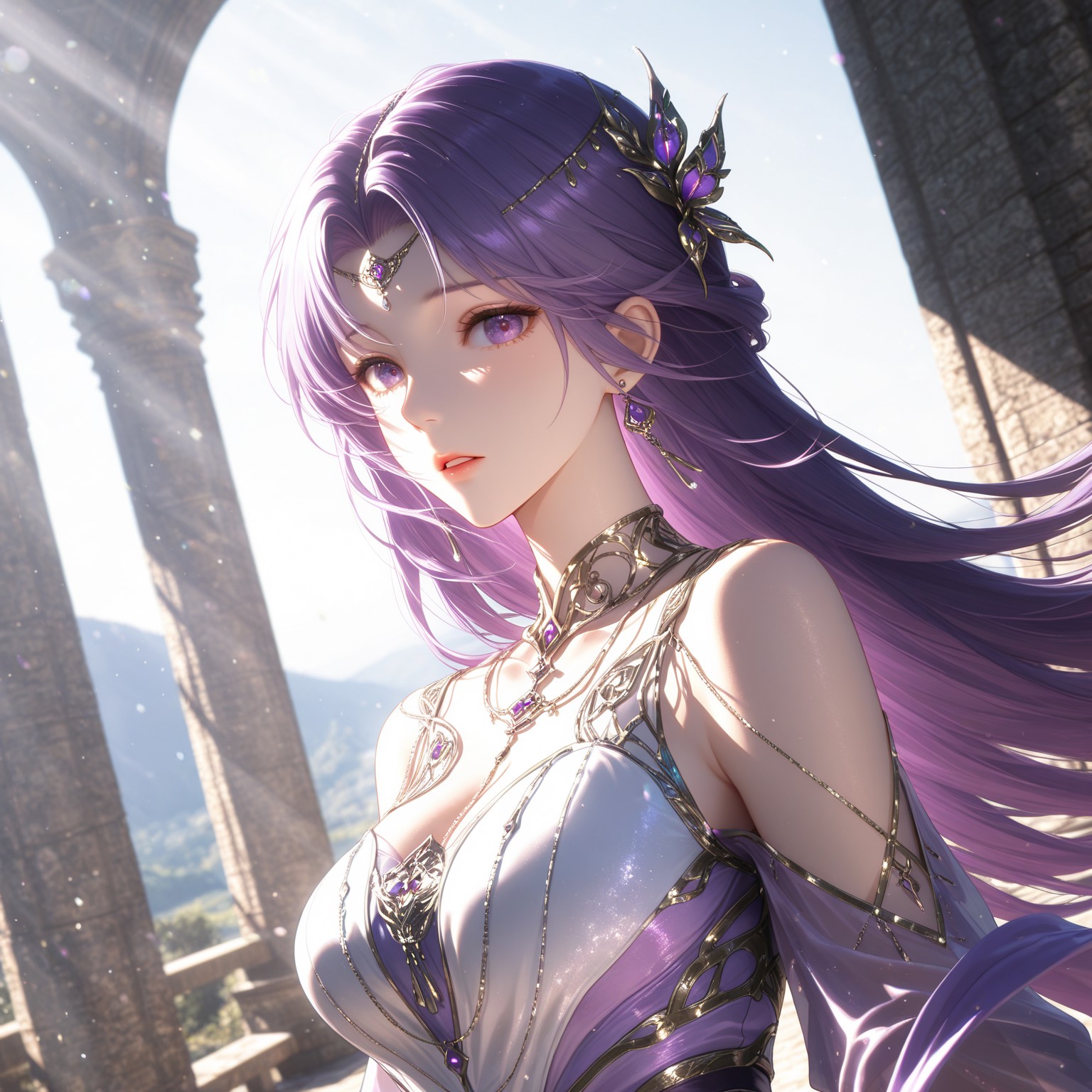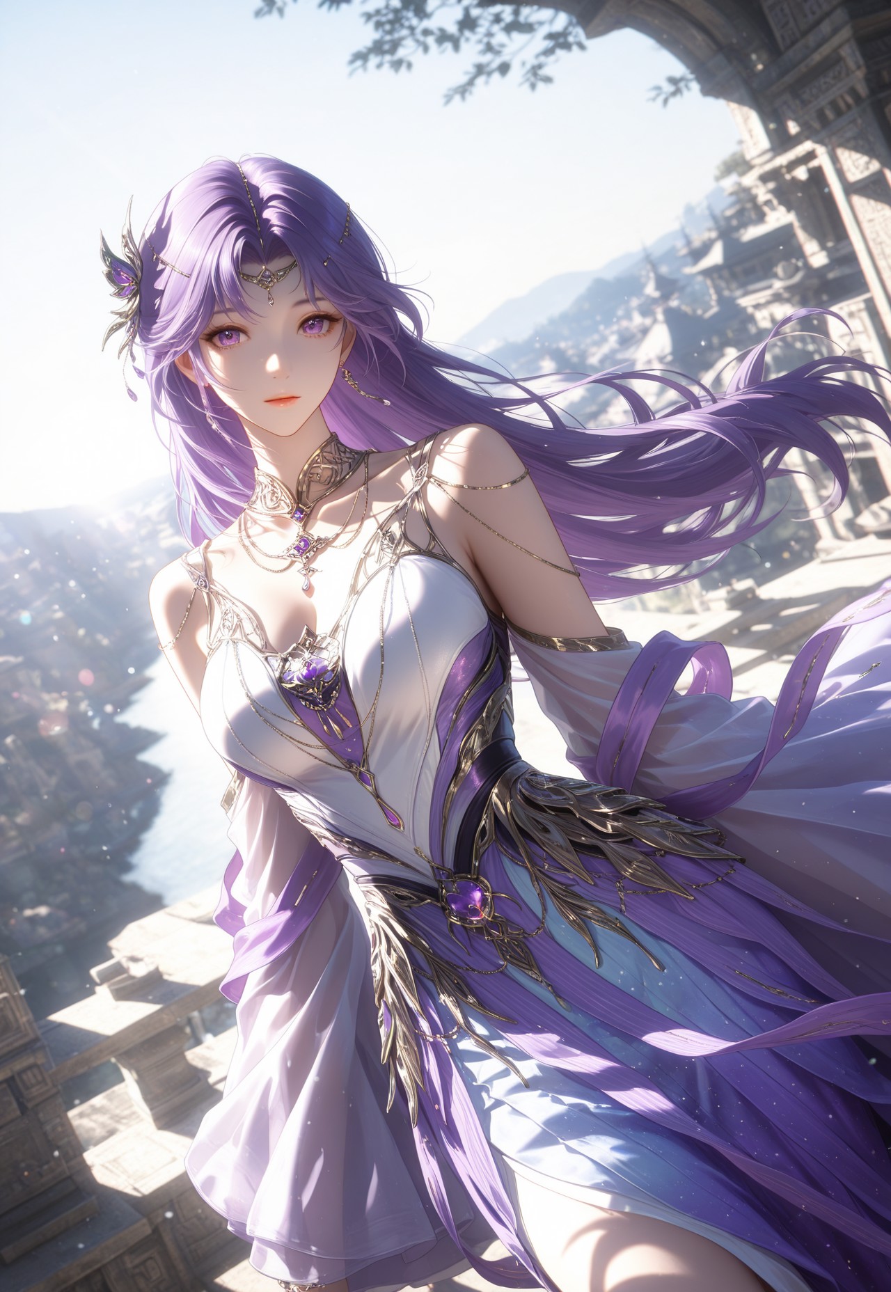 Yun_Xi, long hair, violet hair, hair ornament, parted bangs, circlet, purple eyes, jewelry, earrings, bare shoulders, detachable sleeves, multicolored dress, high heels,