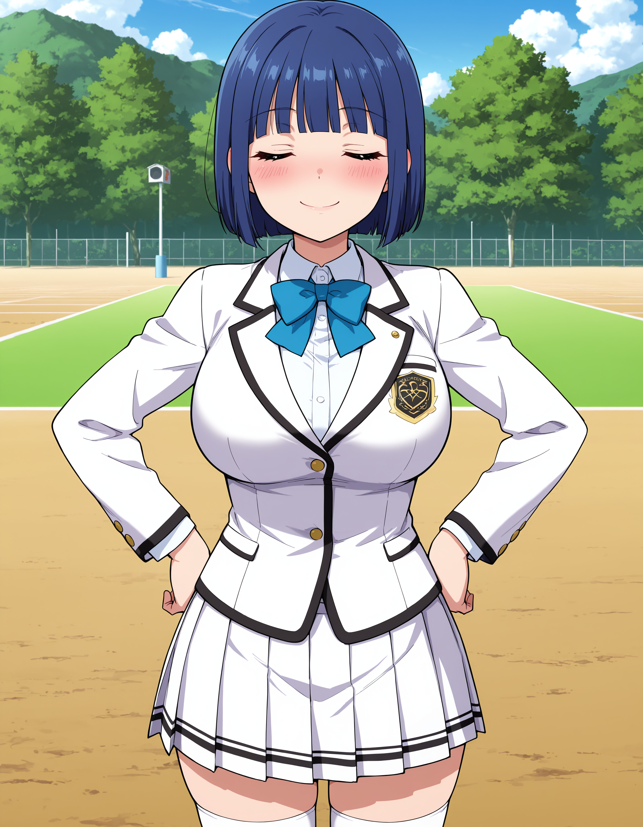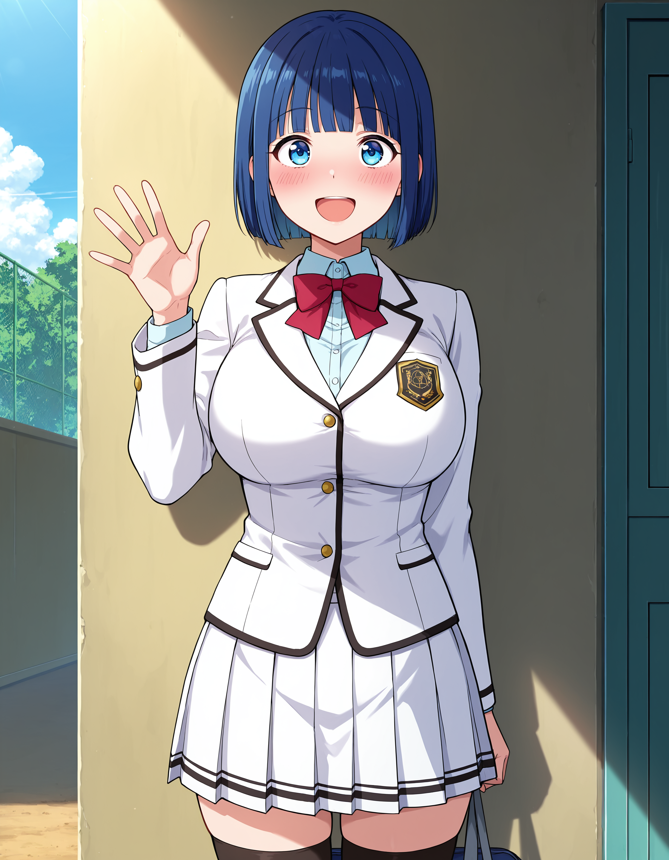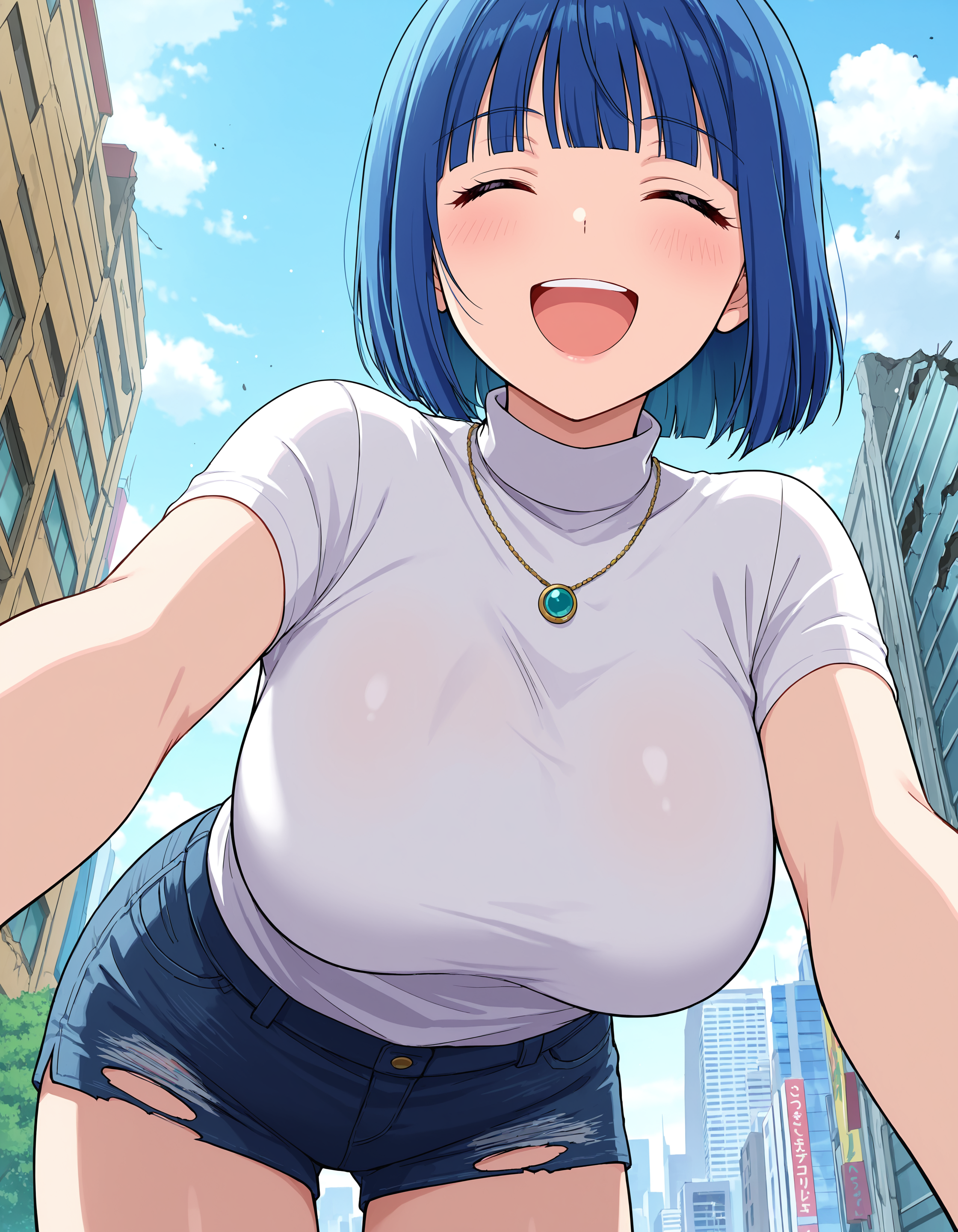 1girl,짧은 헤어,가슴,앞머리,큰 가슴,빗금 앞머리,밥 컷,파란 머리,파란 눈,
