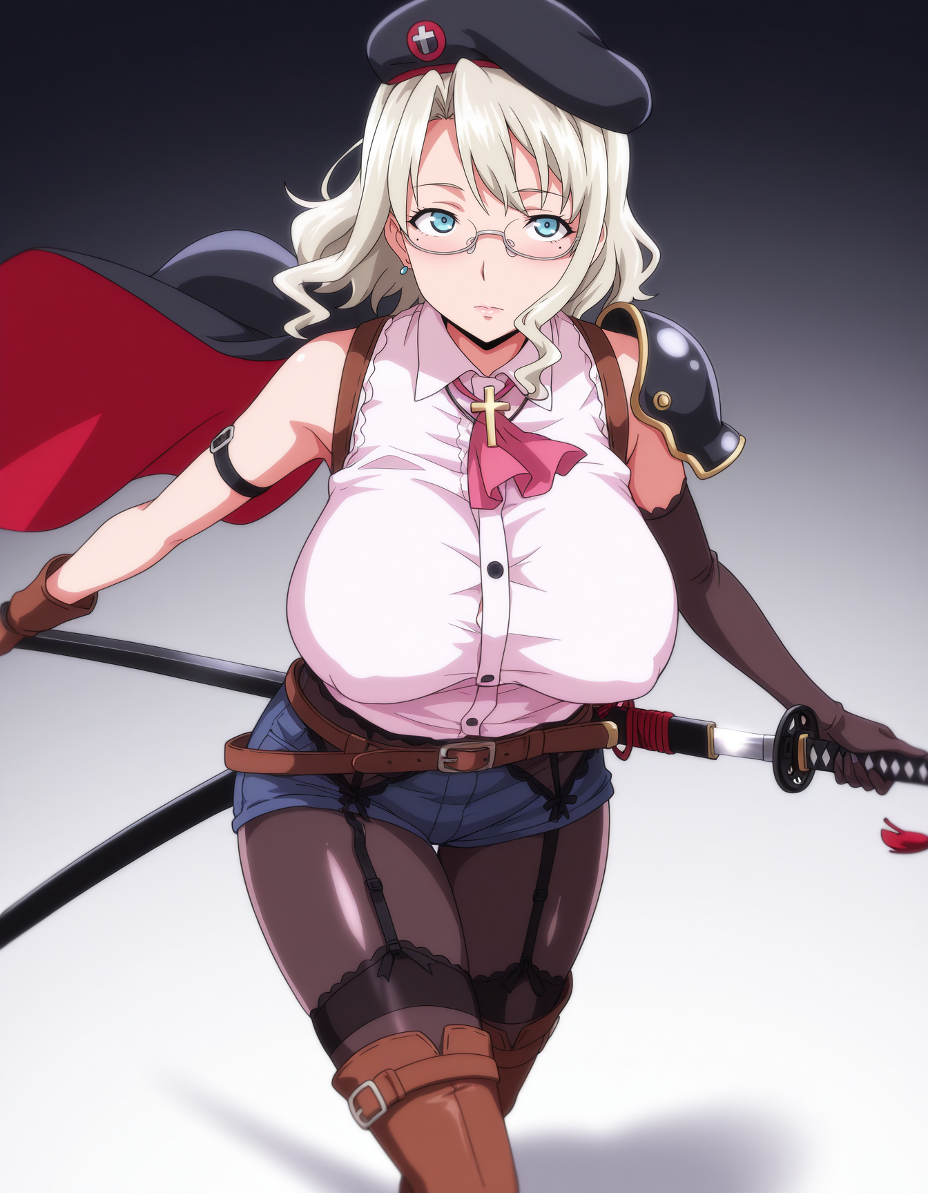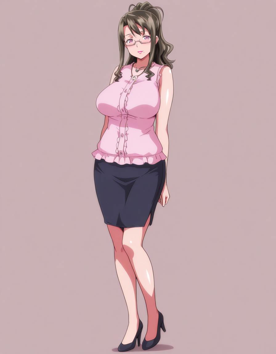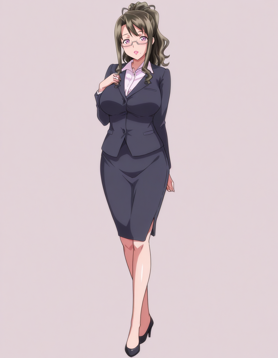 mai_ayakaim,long_hair,brown_hair,mature_female,purple_eyes,mole_under_mouth,large_breasts,under-rim_eyewear,lipstick,turtleneck_sweater,purple_sweater,pencil_skirt,frilled_skirt,purple_skirt,pantyhose,black_high_heels,anime_coloring