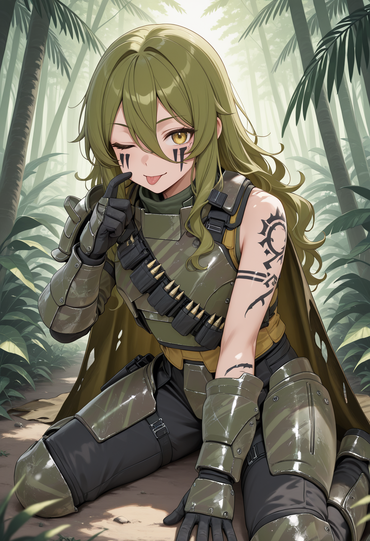 ph202twigsnapper, olive green shirt, asymmetric clothes, asymmetrical sleeves, yellow bulletproof vest, cuirass, ammunition belt slung diagonally across on cuirass, ammunition belt on cuirass, ammunition belt, knife on shoulder, shoulder armor, vambraces, gloves, dark grey tactical pants, side thigh armor, greaves, boots,