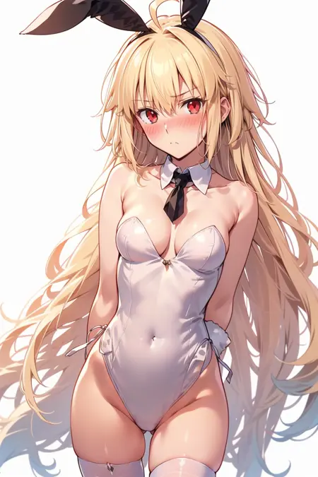 YOU CAN TRY ANOTHER OUTFIT : arcueid, blonde hair, red eyes, long hair, very long hair, bangs, ahoge, sidelocks,medium breast, breasts, cleavage, detached collar, detached sleeves, two-tone strapless sleeveless hime dress, hair flower, gloves, white gloves,