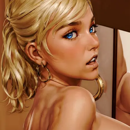 Trigger :felicia, woman, long hair, ponytail, tan, hoop earrings, mole on breast, bracelet, chocker, dress, see through, high heels