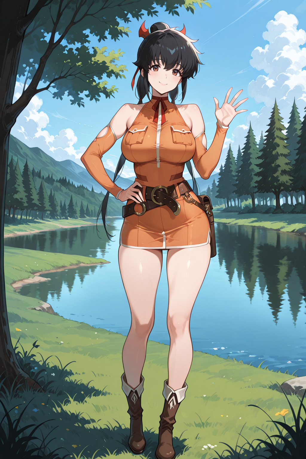 hair ribbon, ribbon, bare shoulders, detached sleeves, orange dress, short dress, belt, boots