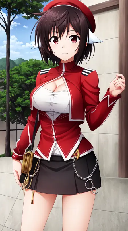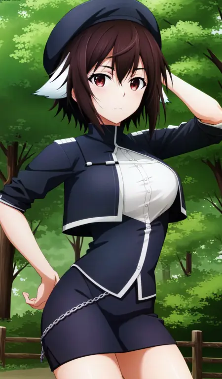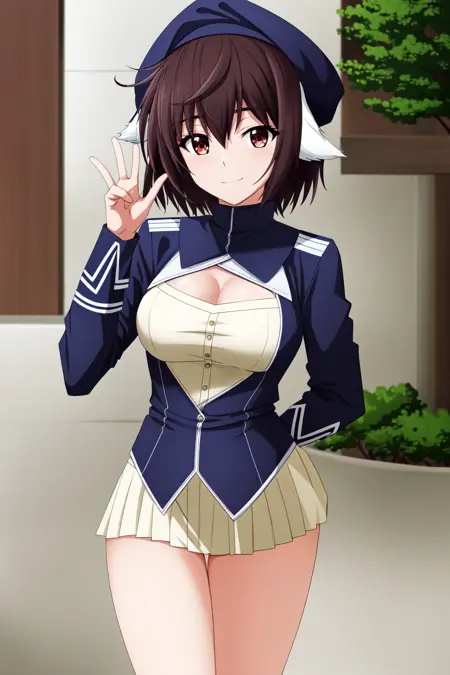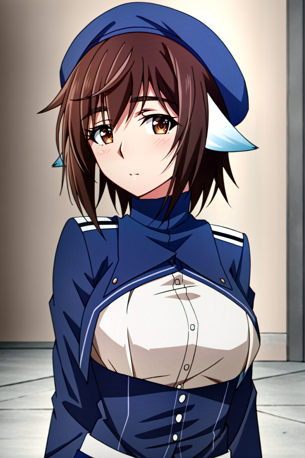 Lyne Mei, 1girl, solo, short hair, brown hair, brown eyes, looking at viewer, upper body, closed mouth, blue headwear, animal ears, breasts