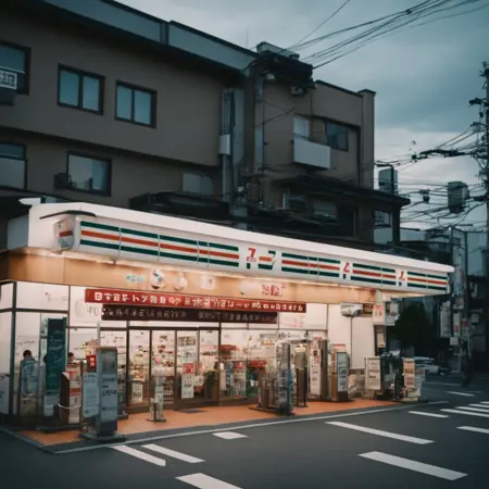 seveneleven, konbini, scenery, storefront, japan, scenery, convenience store, shop, building, outdoors, road, cityscape, city, sky, street, sign, lamppost, real world location
