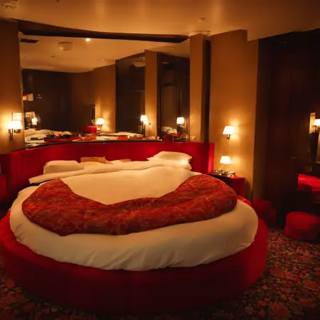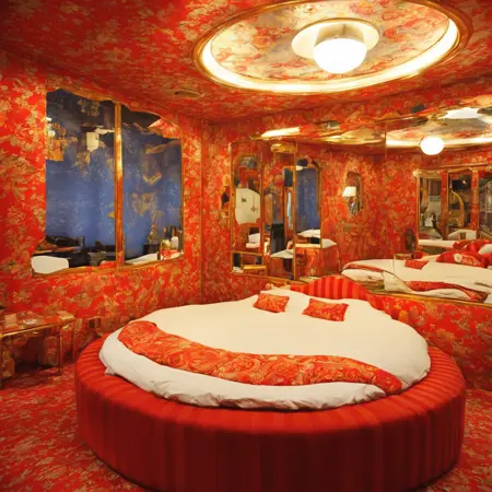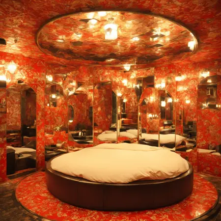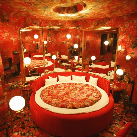 쇼와 시대의 러브호텔에 있는 큰 회전 원형 침대가 있는 풍경을 어쩌면 그릴 수 있을지도 모르는 LoRA입니다.