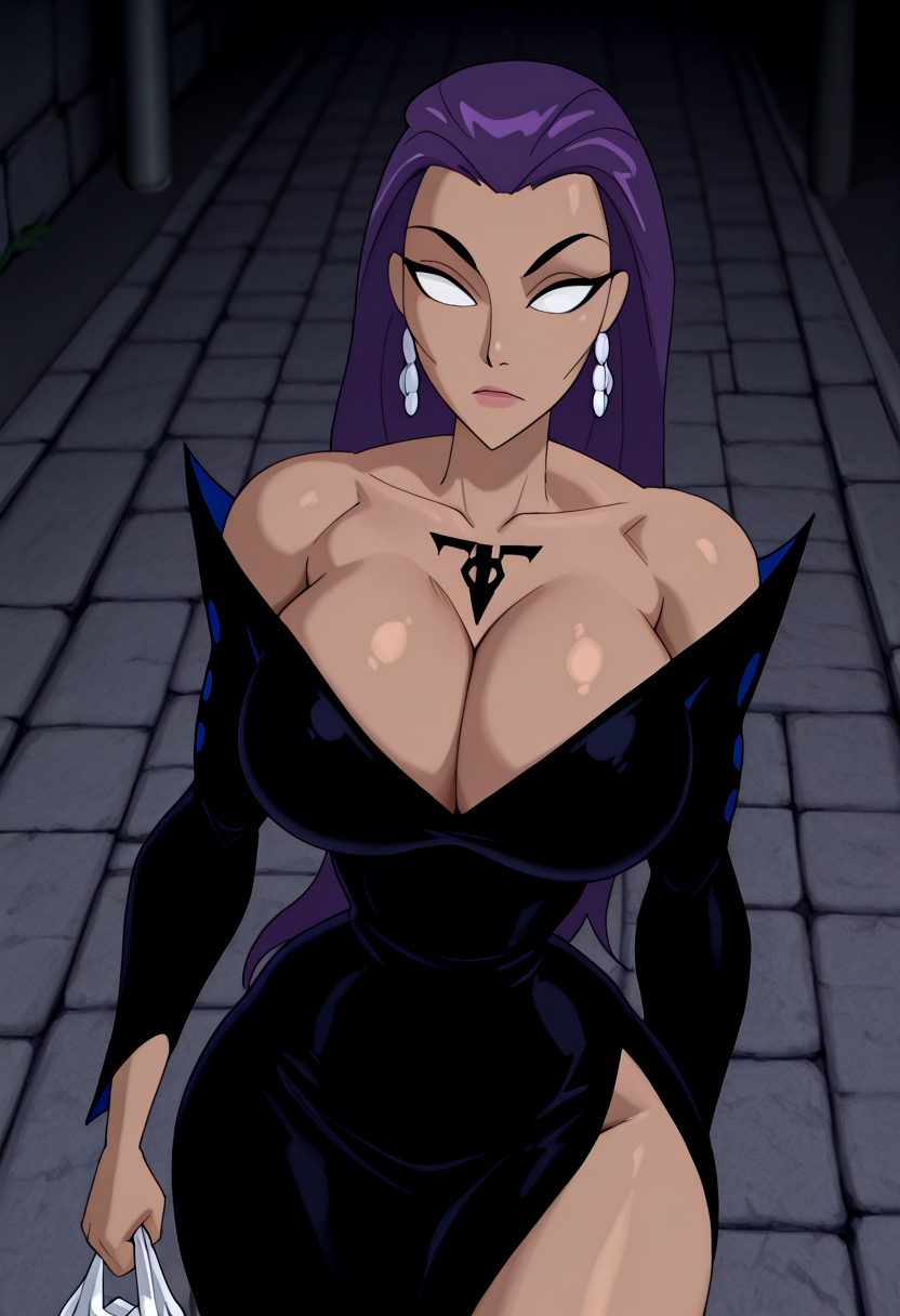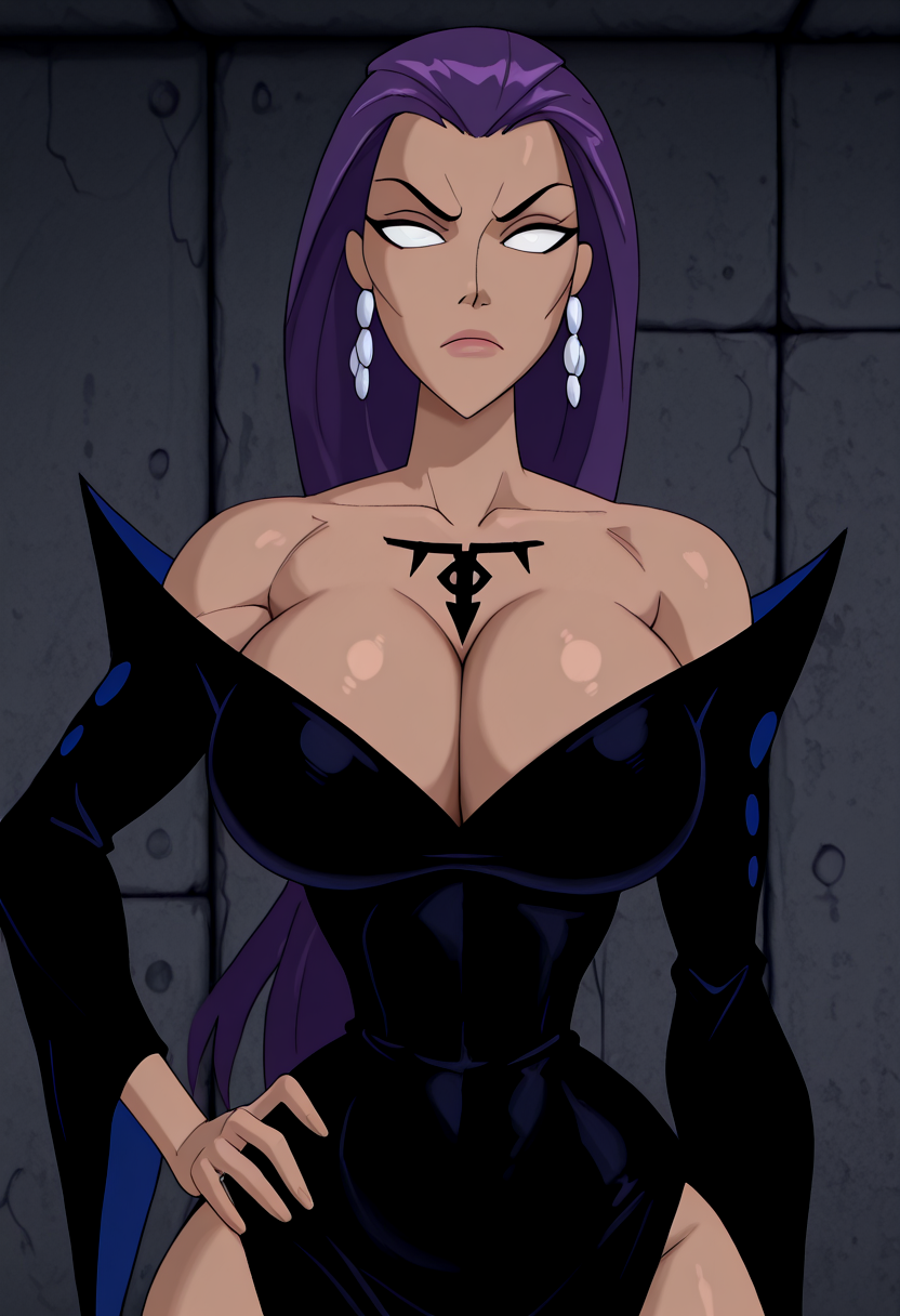 purple hair, long hair, dark skinned female, white eyes, no pupils, chest tattoo,