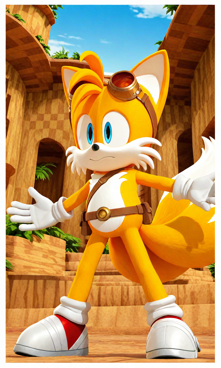 BoomTails, 1boy, yellow fox, large blue eyes, white gloves, red-and-white shoes, two tails, sonic the hedgehog, white chest, brown goggles on head, body fur, brown belt, white bandages on shoes