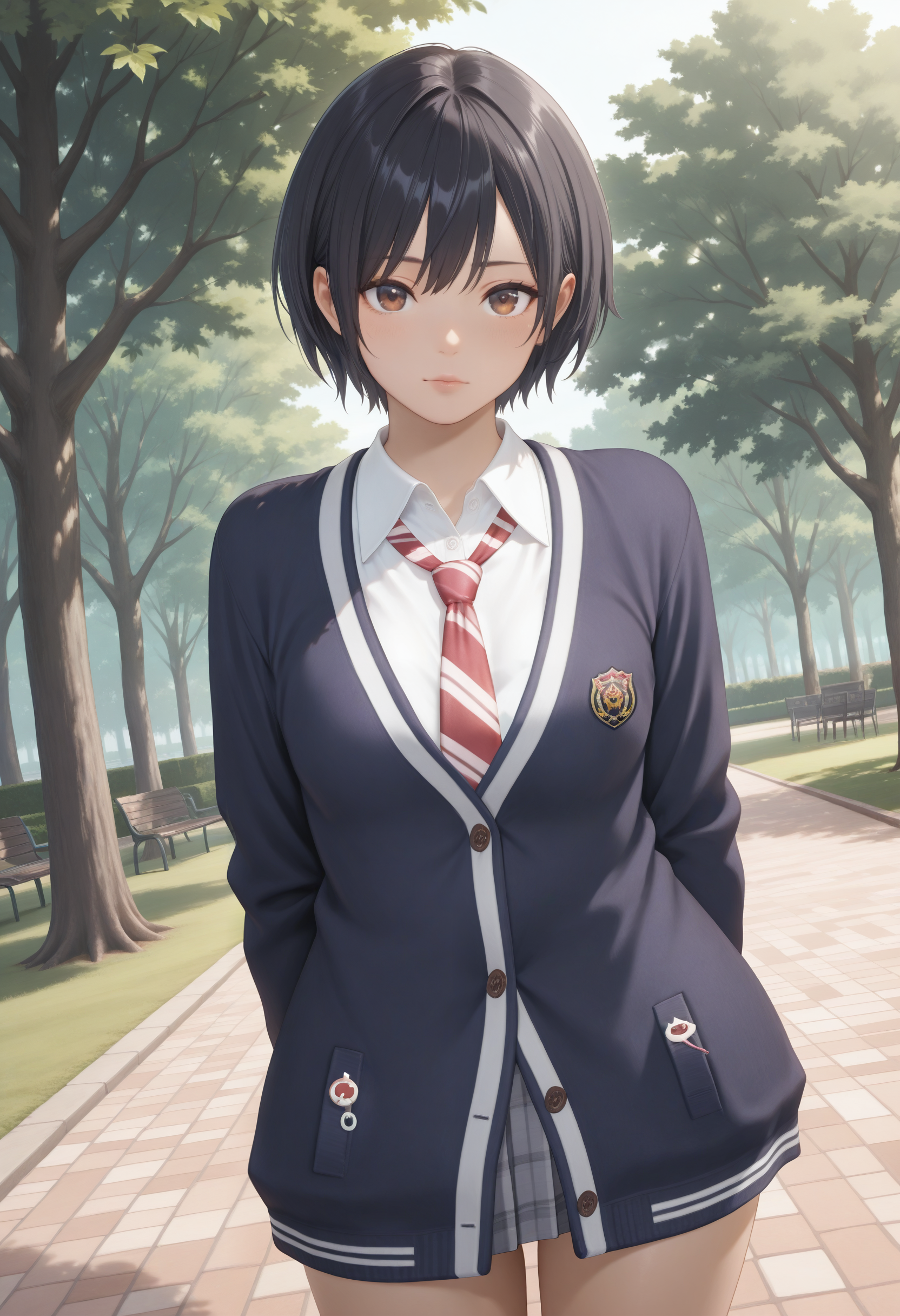 基本プロンプト:"school uniform,navy cardigan,collared shirt,pink striped necktie,grey striped skirt,navy socks,loafers"