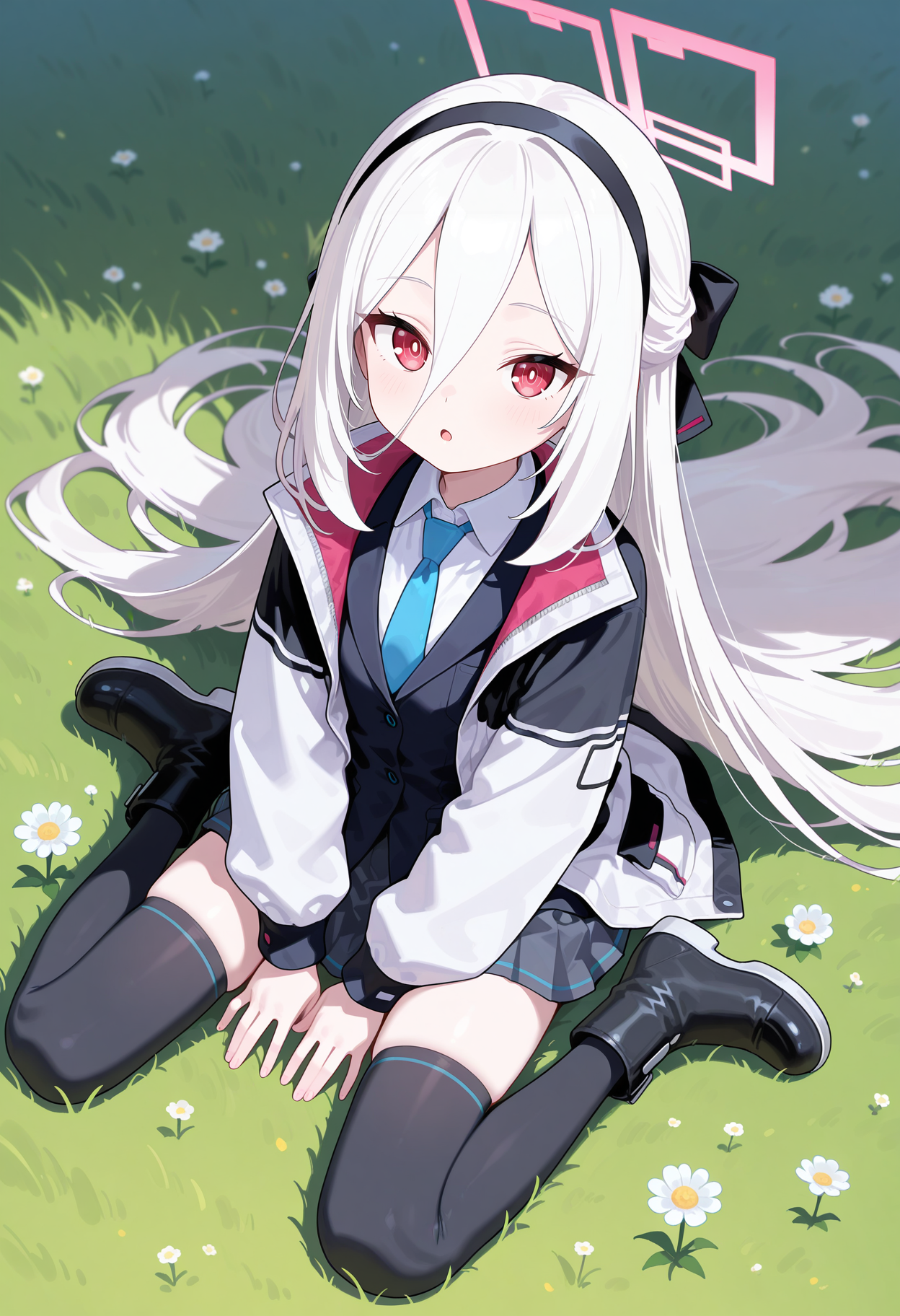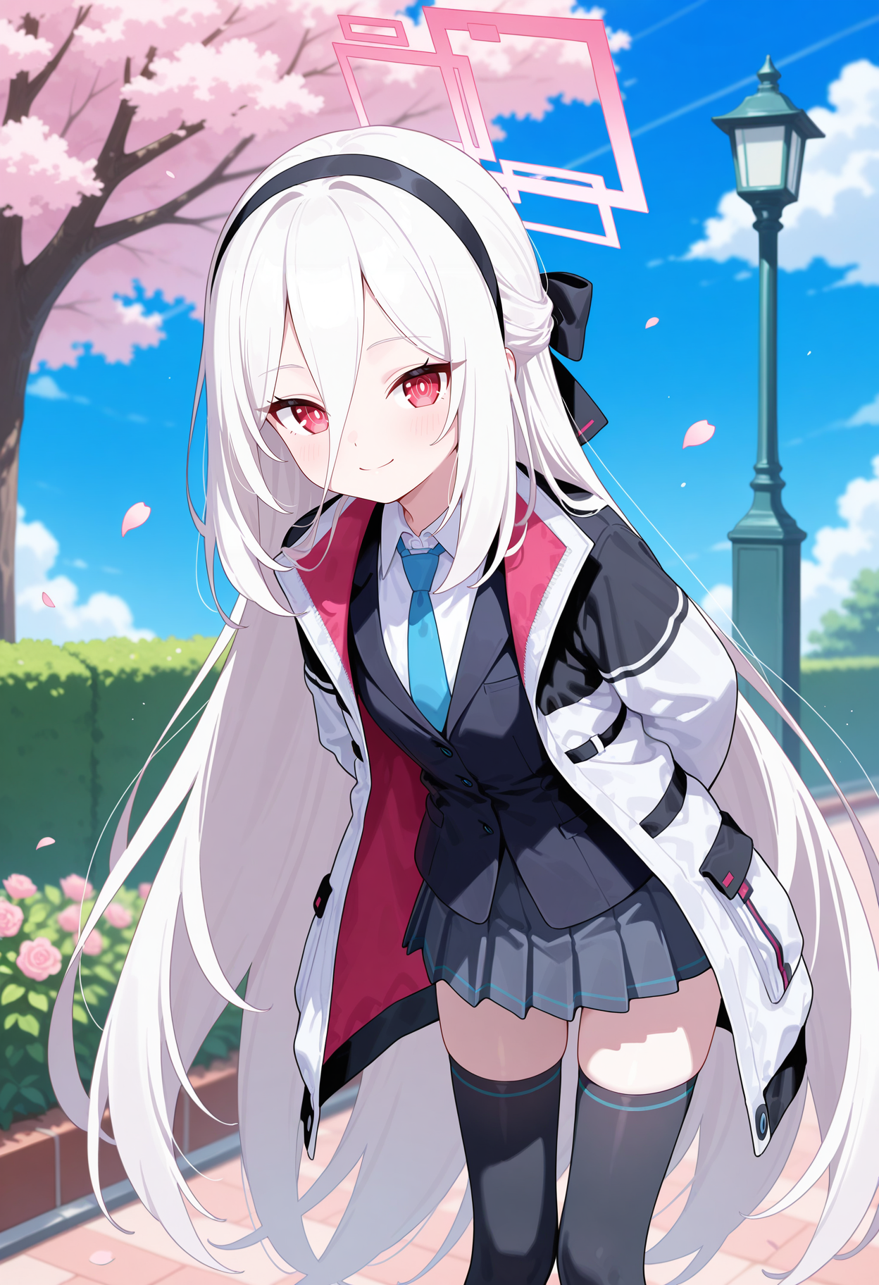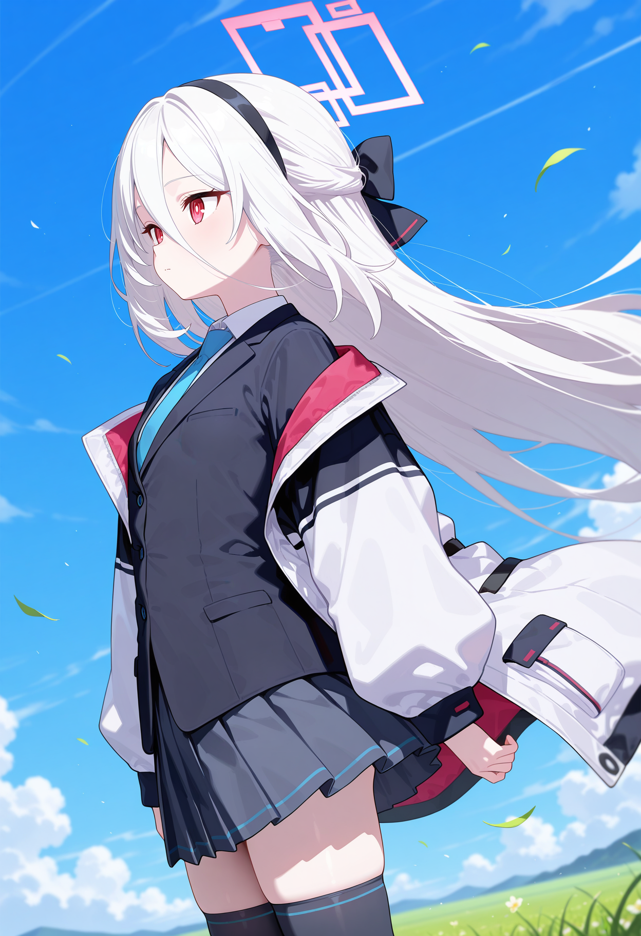 aakei, 긴 머리, 하얀 머리, 환상, 검은 머리끈, 머리 리본, 눈 사이의 머리, 붉은 눈, 파란 넥타이, 칼라 셔츠, 흰 셔츠, 계층적인 옷차림, 블레이저, 검정 재킷, 흰 재킷, 긴 소매, 주름치마, 회색 치마, 검은 허벅지 스타킹