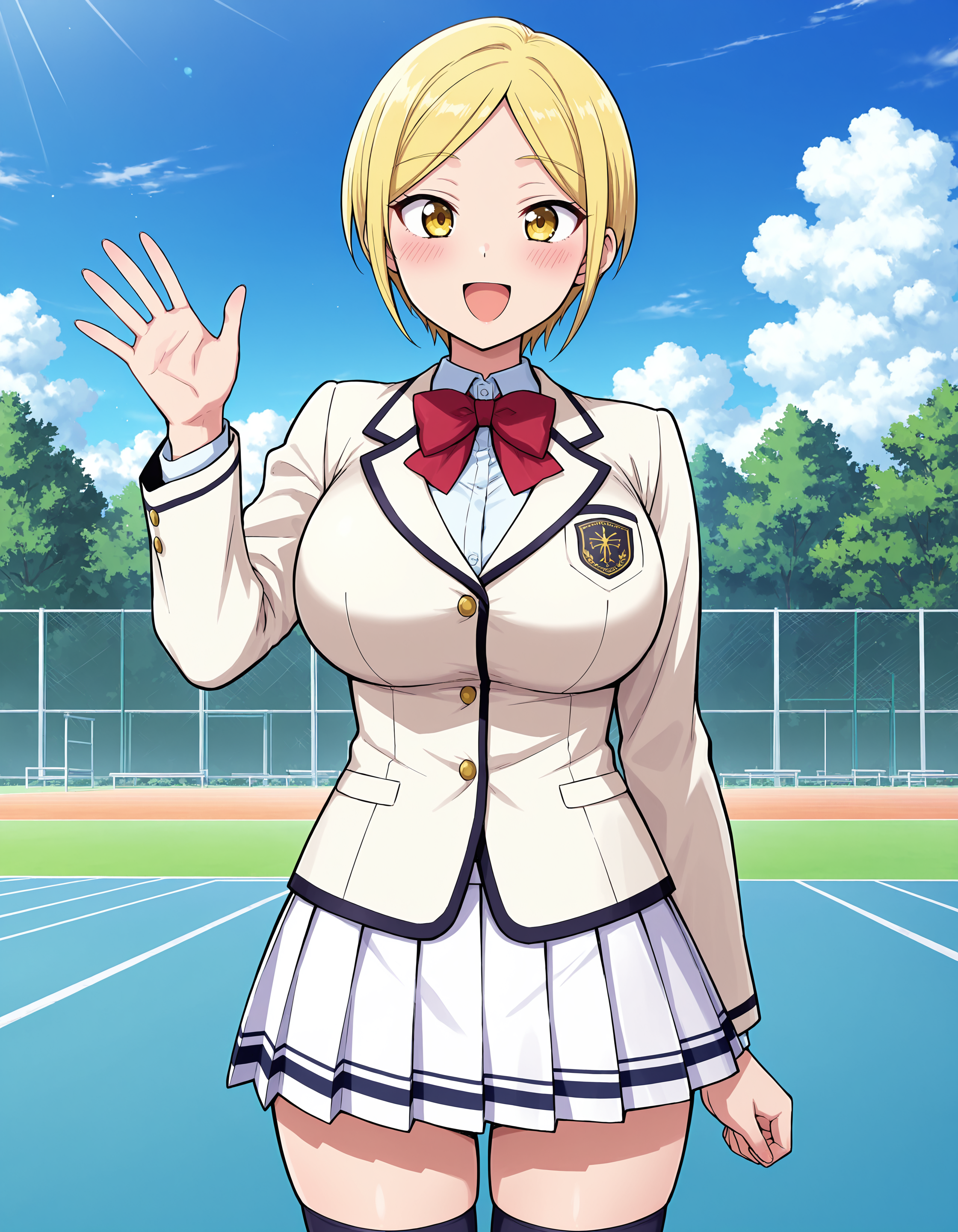 1girl, blonde hair, yellow eyes, short hair, big breasts,