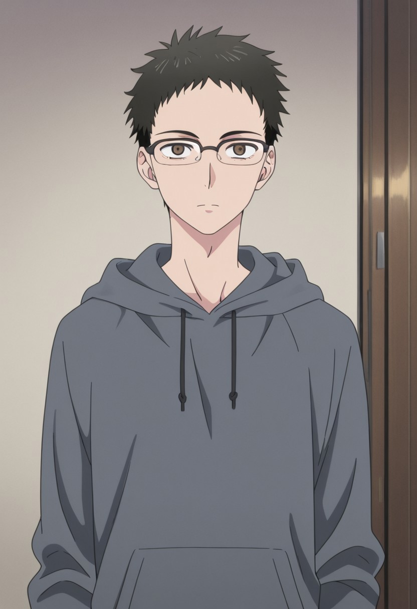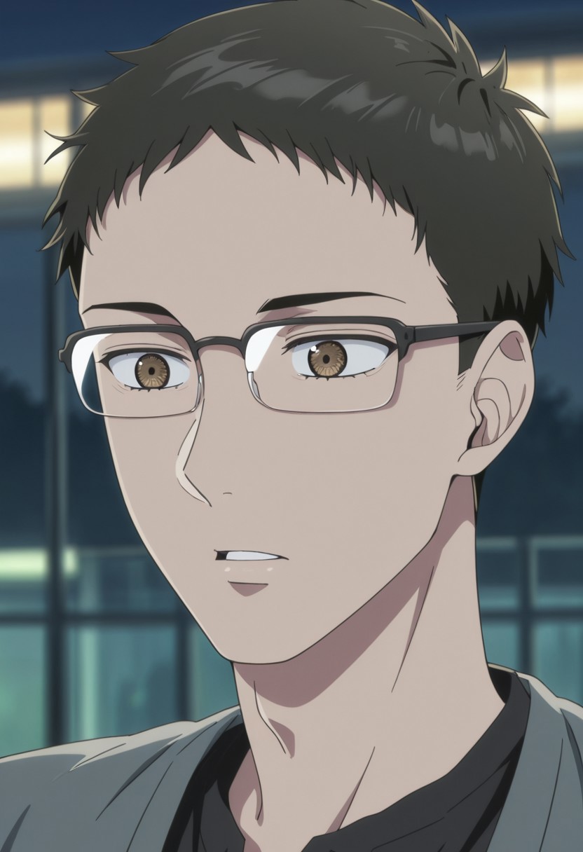 1boy, male focus, solo, brown eyes, glasses, black hair, forehead, black shirt, grey jacket, open jacket,