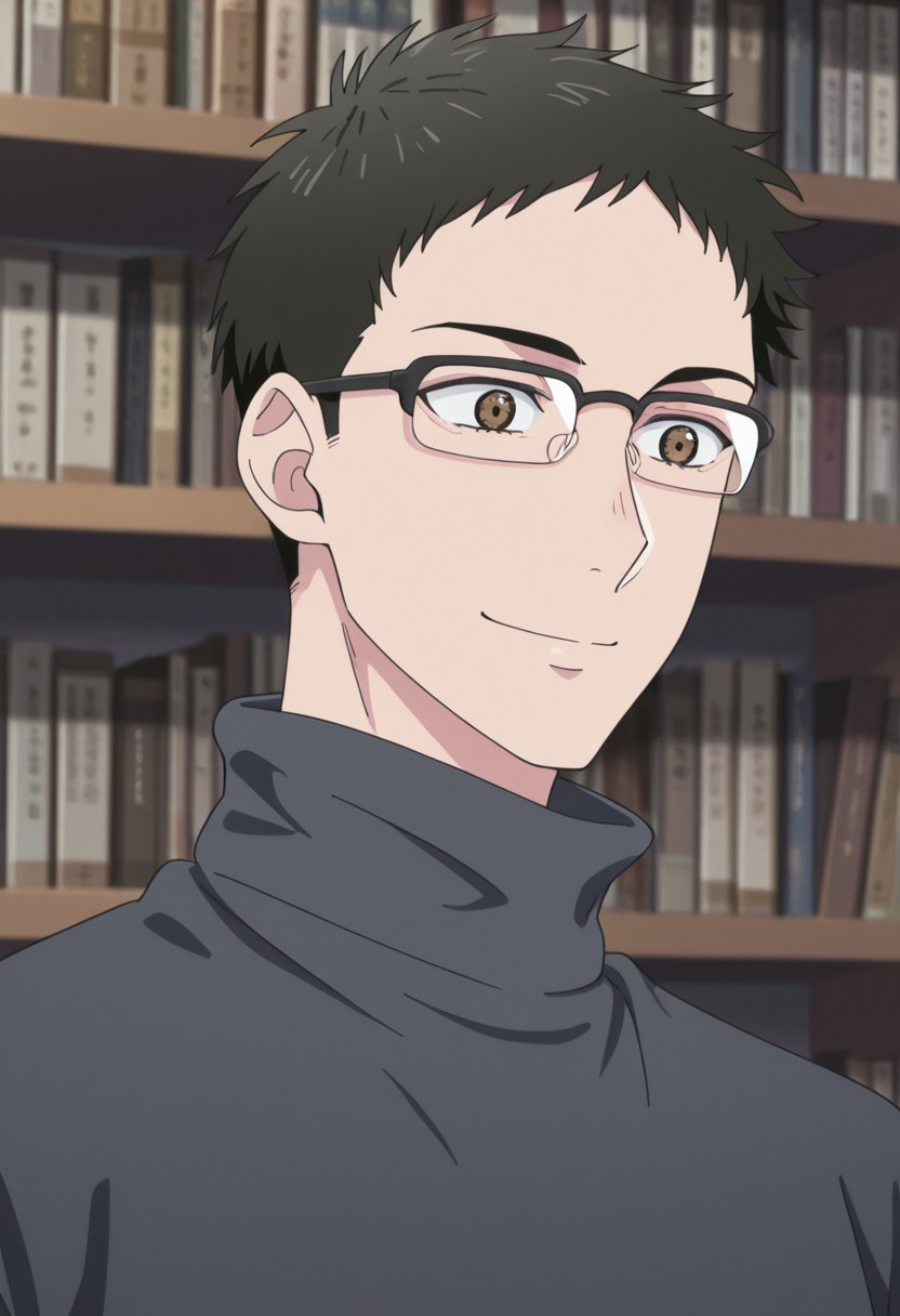 1boy, male focus, solo, brown eyes, glasses, black hair, forehead, black sweater, turtleneck, blue pants,