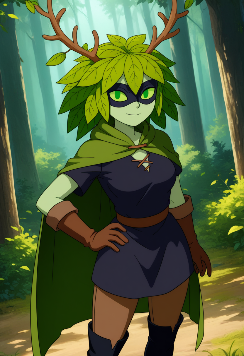 Huntress_Wizard, Default_Body, 컬러드 스킨, 녹색 피부, 녹색 공막, 녹색 눈, 뿔, 잎 모양 머리카락, 녹색 머리카락,