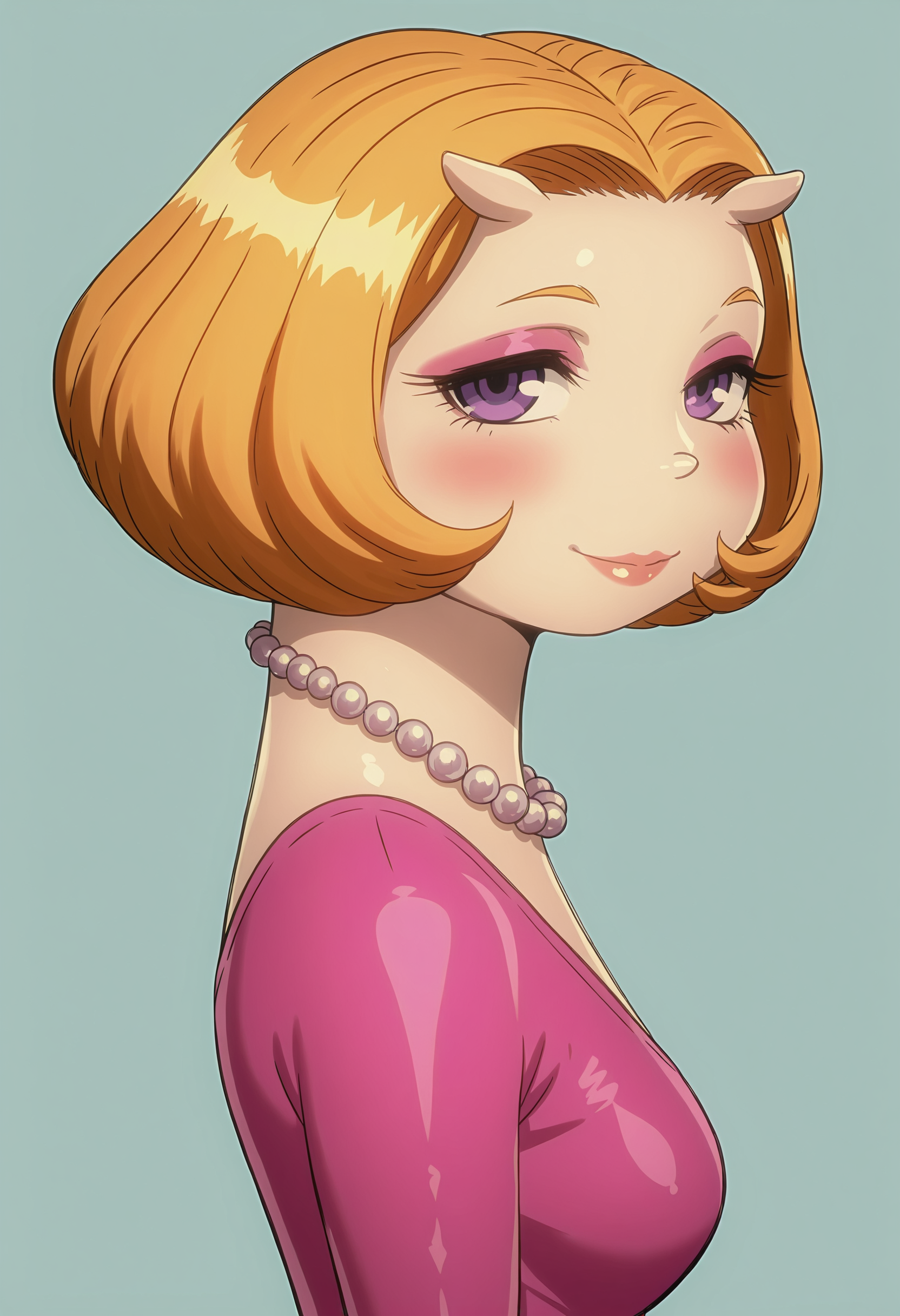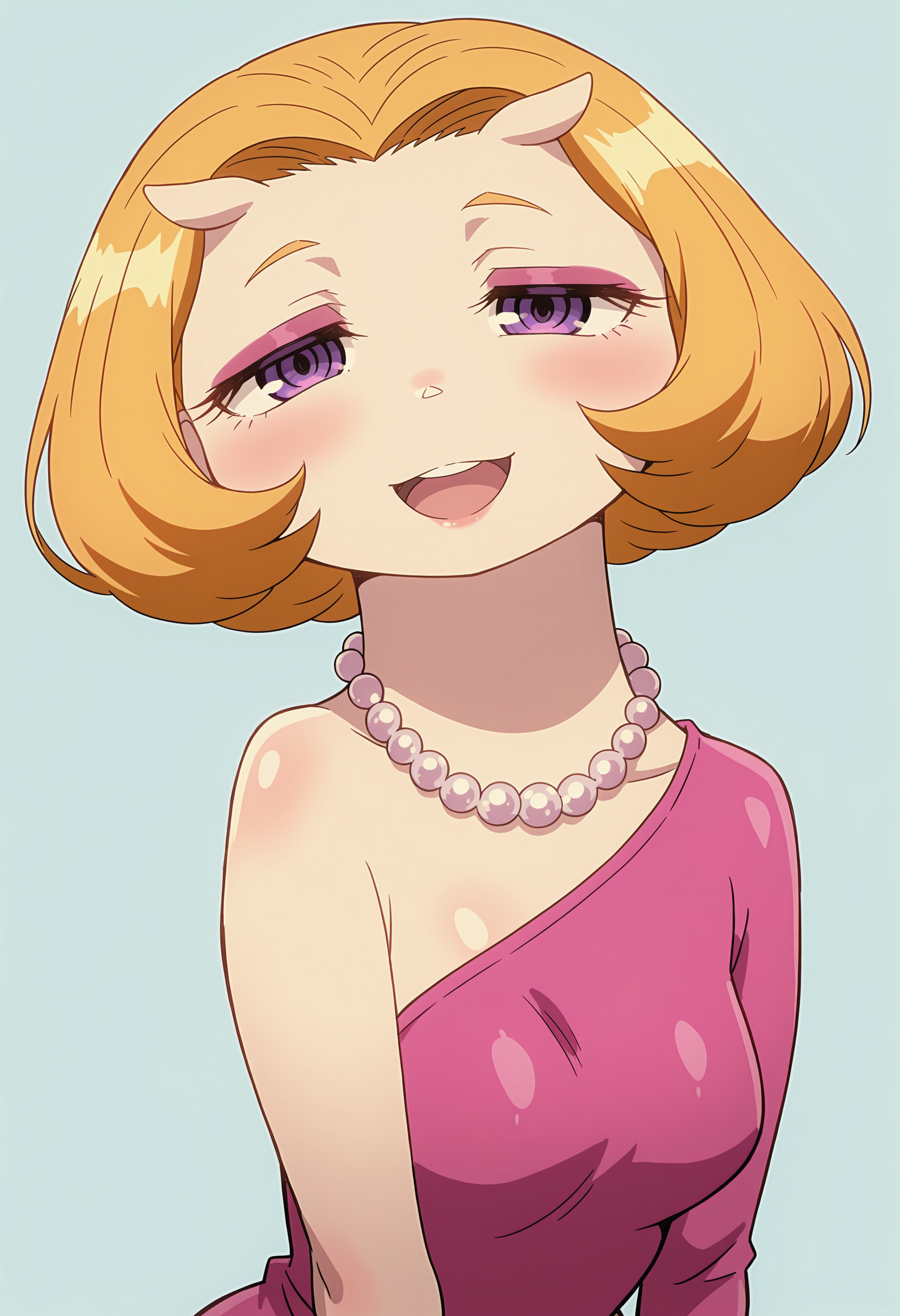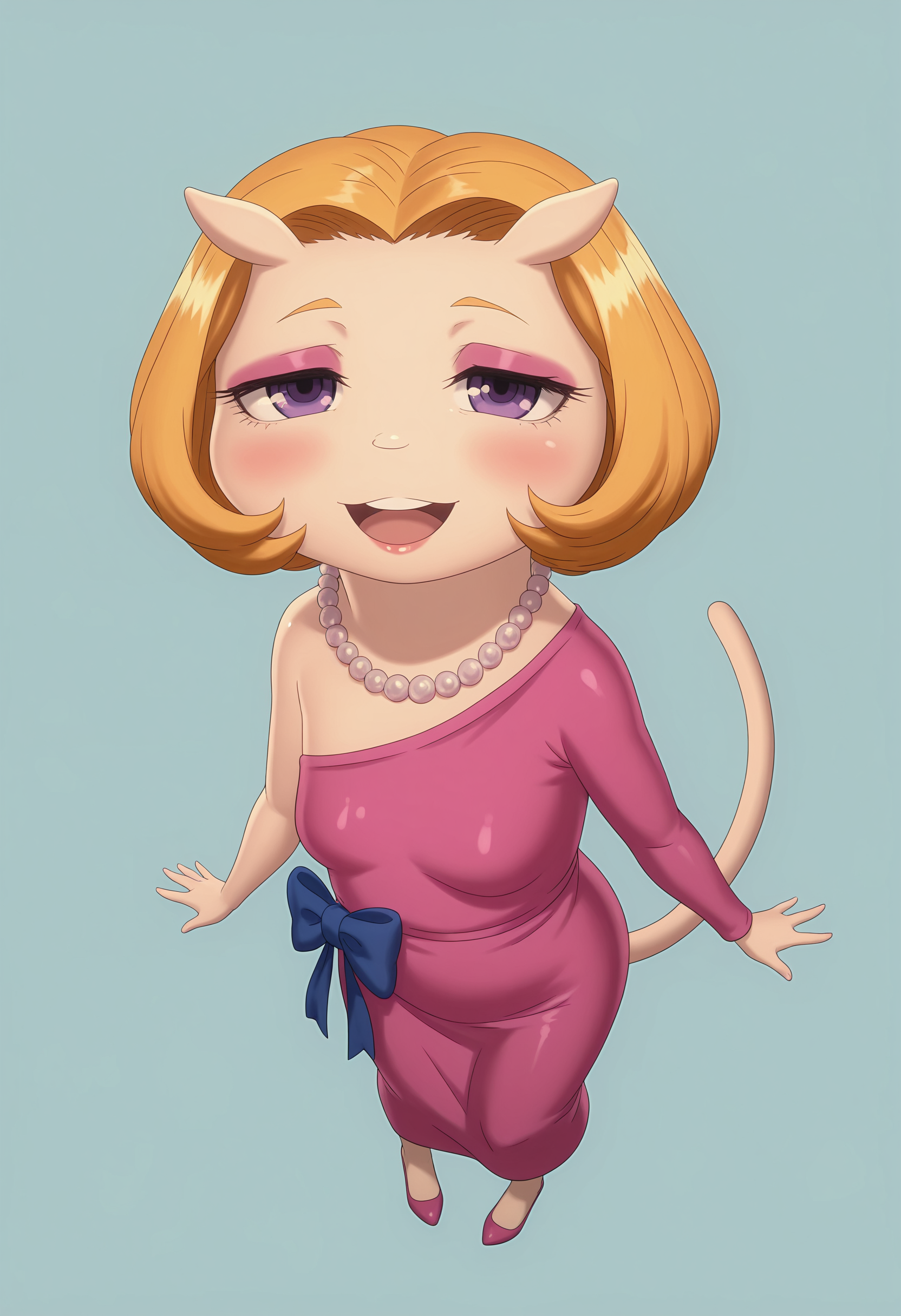 • katsilf, 금발, 보라색 눈, 진주 목걸이, 분홍색 드레스, 리본, 꼬리