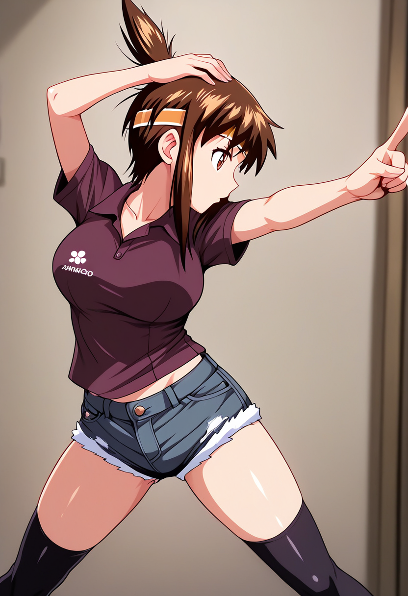 트리거 단어: jangopointingup, pointing up, legs apart, hand on headwear, hand on own head
