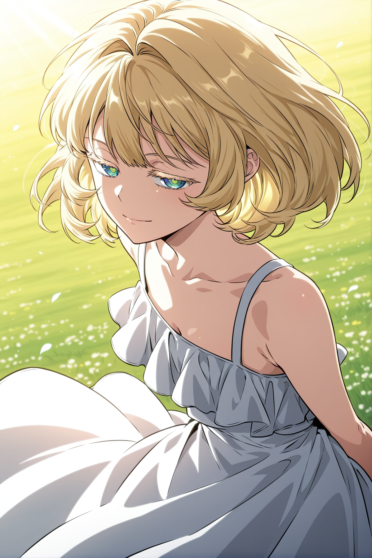 ラチェル、1girl、単体、緑の目、青い目、金髪、短い髪、ボブカット、まっすぐな前髪、サイドロックス、