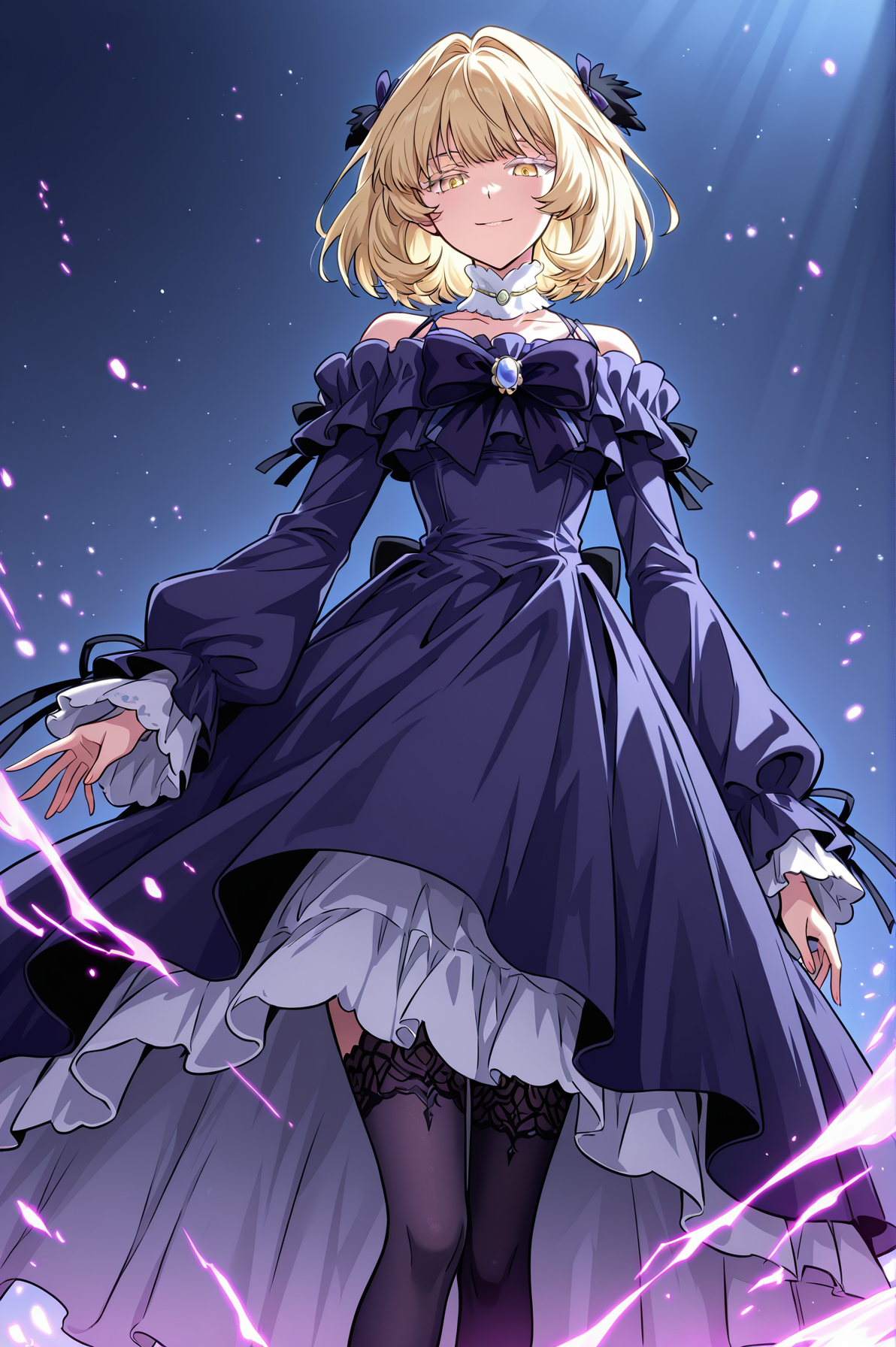 ラチェル、1girl、単体、金色の目、金髪、短い髪、ボブカット、まっすぐな前髪、濃い紫のリボン、白いチョーカー、ジュエリー付きチョーカー、