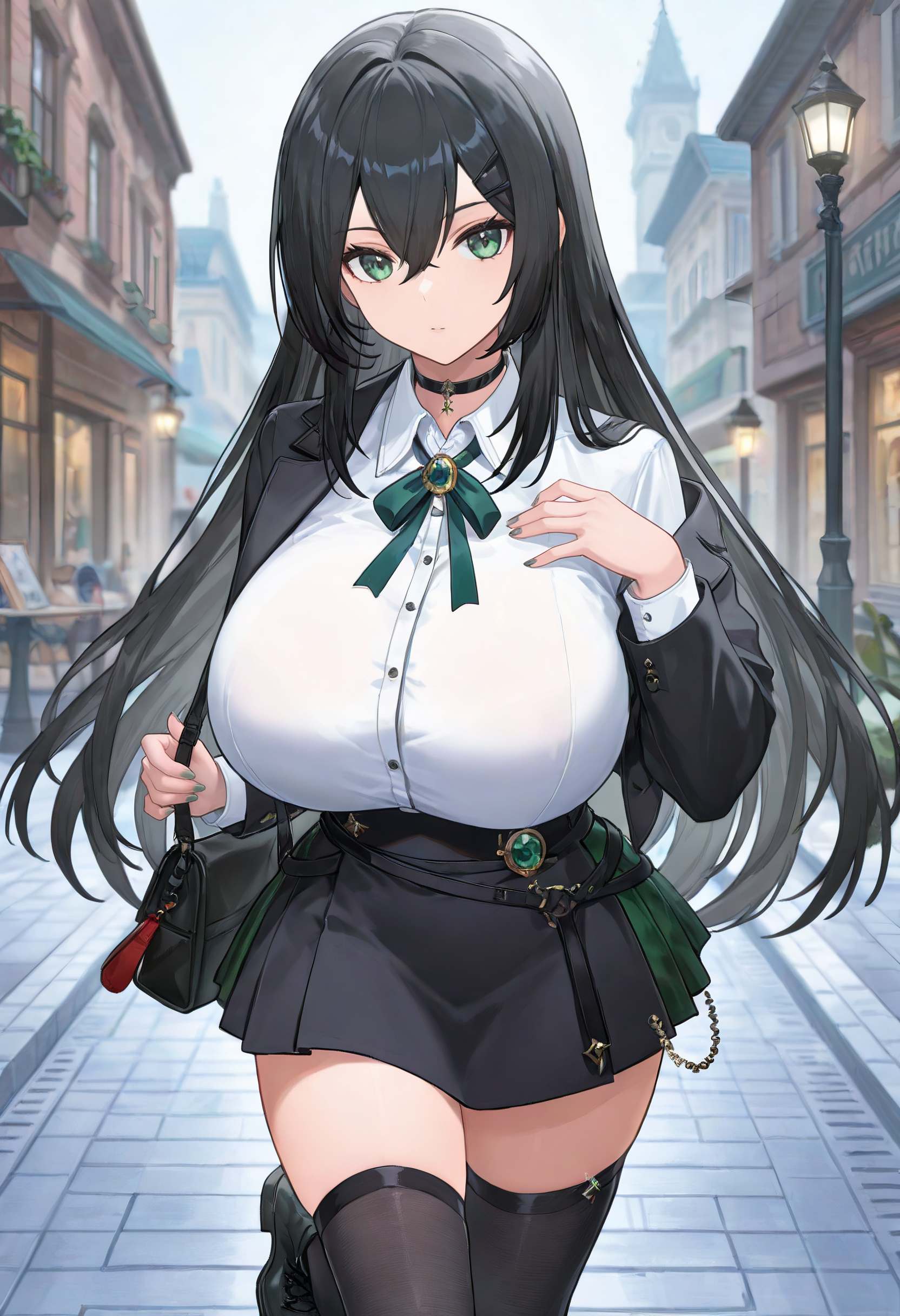 머리 장식, 머리핀, 검은 재킷, 벌어진 재킷, 셔츠, 칼라 셔츠, 흰색 셔츠, 긴 소매, 초크, 벌어진 옷, 녹색 리본, 총집, 가방, 허리 높은 스커트, 미니스커트, 주름 스커트, 검은 스커트, 검은 허벅지 양말, 검은 신발, 부츠, 십자 끈 신발,