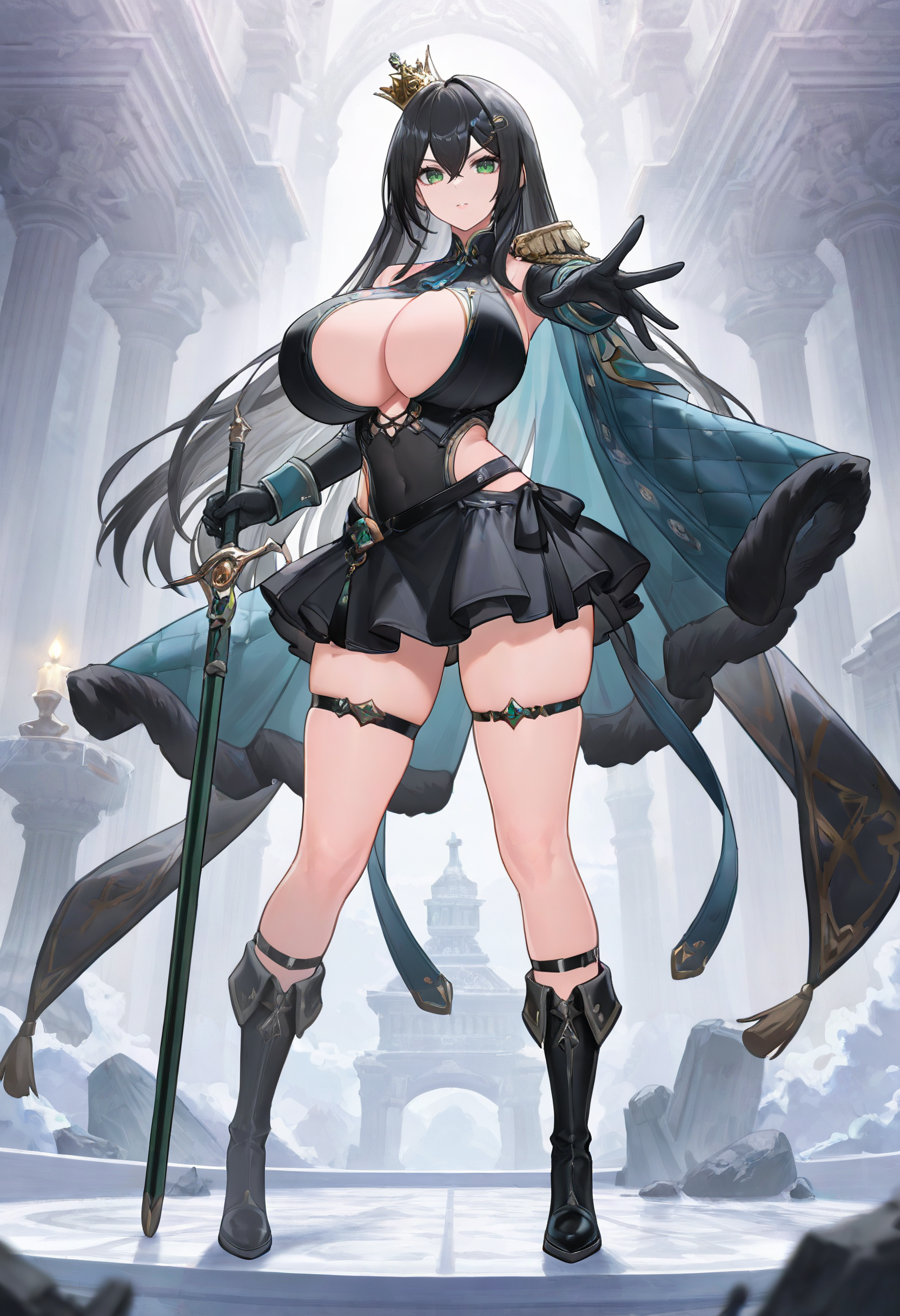 공식 대체 복장, 미니 왕관, 머리 장식, 소매 없는 드레스, 짧은 드레스, 스커트, 검은 드레스, 가슴 노출, 옷의 절개, 긴 소매, 배꼽 가림, 단일 어깨장식, 망토, 검은 장갑, 허벅지 스트랩, 검은 신발, 하이힐 부츠,