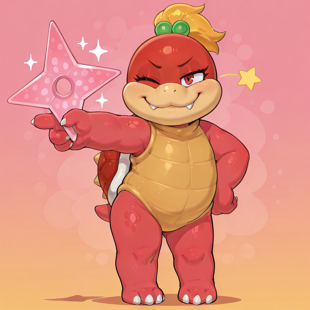 | 학습된 단어 | koopa female, chubby, solo, dark pink scales, red head, red eyes, light brown mouth, light yellow mouth, plain red shell with white accent, white nails, two large white fangs, green ornaments in hair, orange to yellow gradient straight ponytail, light orange body, dark pink arms, dark pink legs,복사됨! |