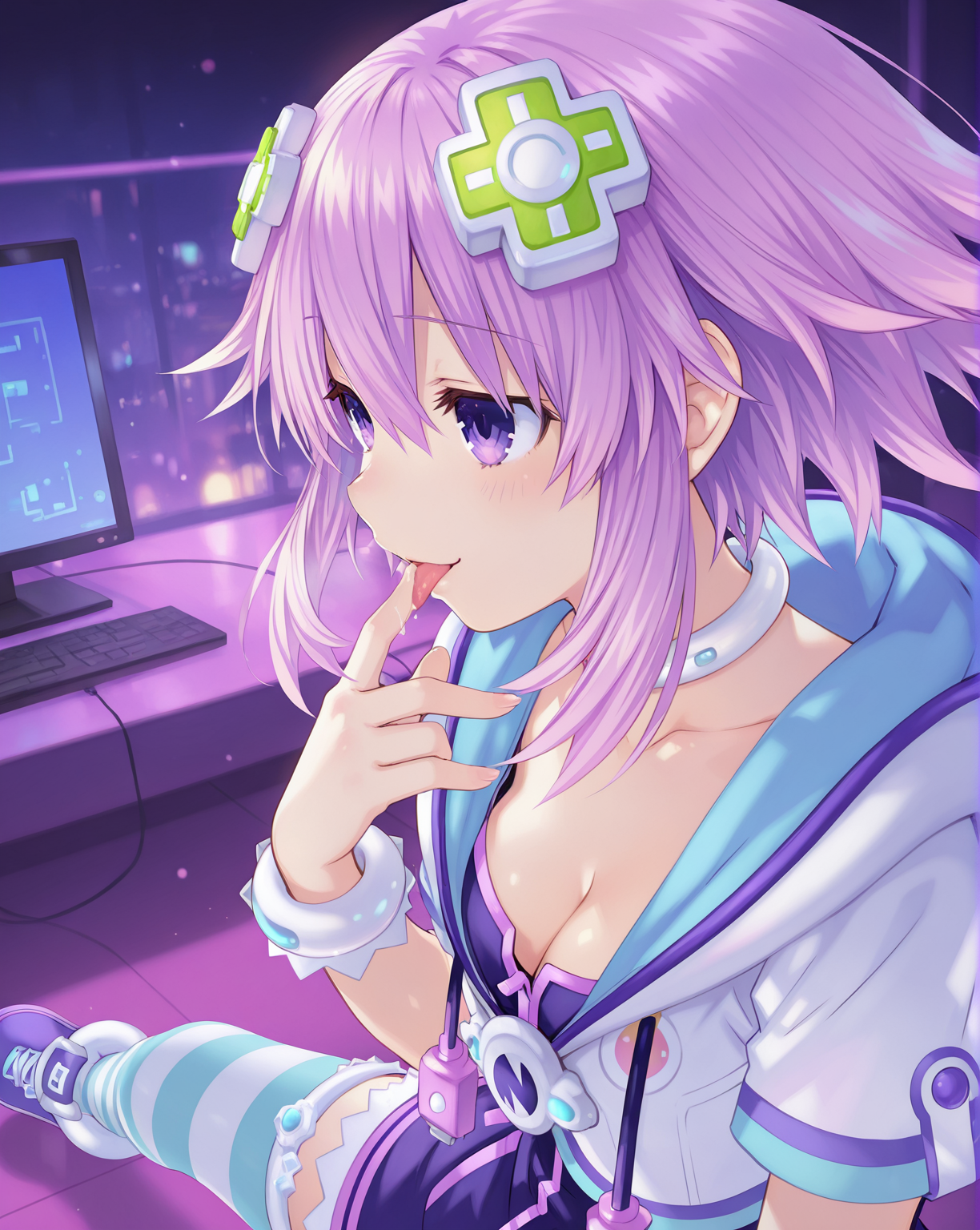 HyperNep,neptune \(neptunia\),1girl,striped thighhighs,solo,striped clothes,purple hair,hair ornament,purple eyes,d-pad,d-pad hair ornament,bracelet,purple footwear,hood,choker,jewelry,short sleeves,short hair,hoodie,purple dress,shoes,