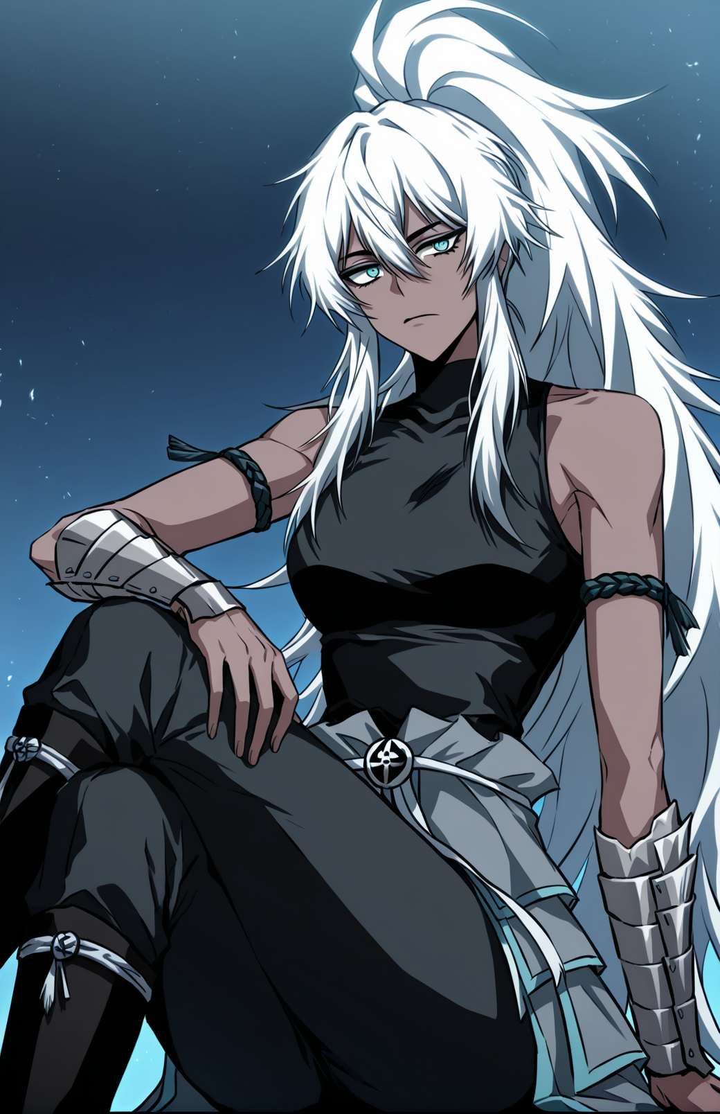 Sameng、1人 Girl、単独、濃い肌、水色の目、白髪、長い髪、レイヤードヘア、乱れた髪、長い前髪、乱れた前髪、目の中の髪、高いポニーテール、長い横髪、筋肉質な体型、