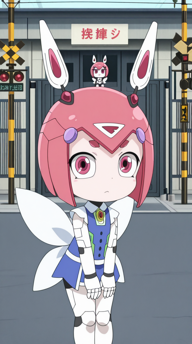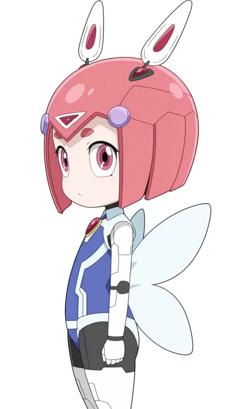 em pino, short hair, animal ears, pink hair, wings, pink eyes, chibi, robot, android, style parody, joints, robot joints, mechanical ears, anime screencap