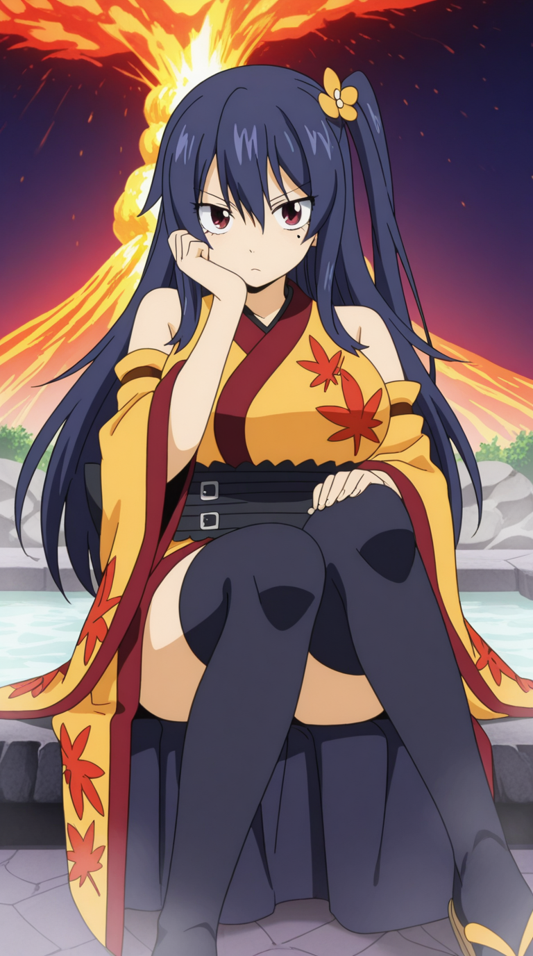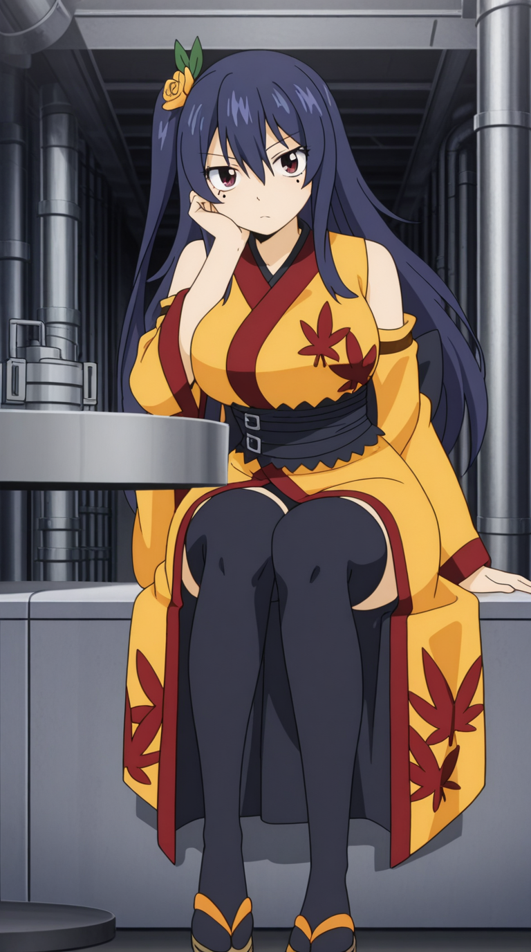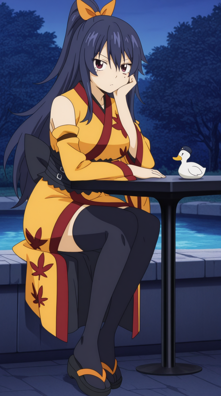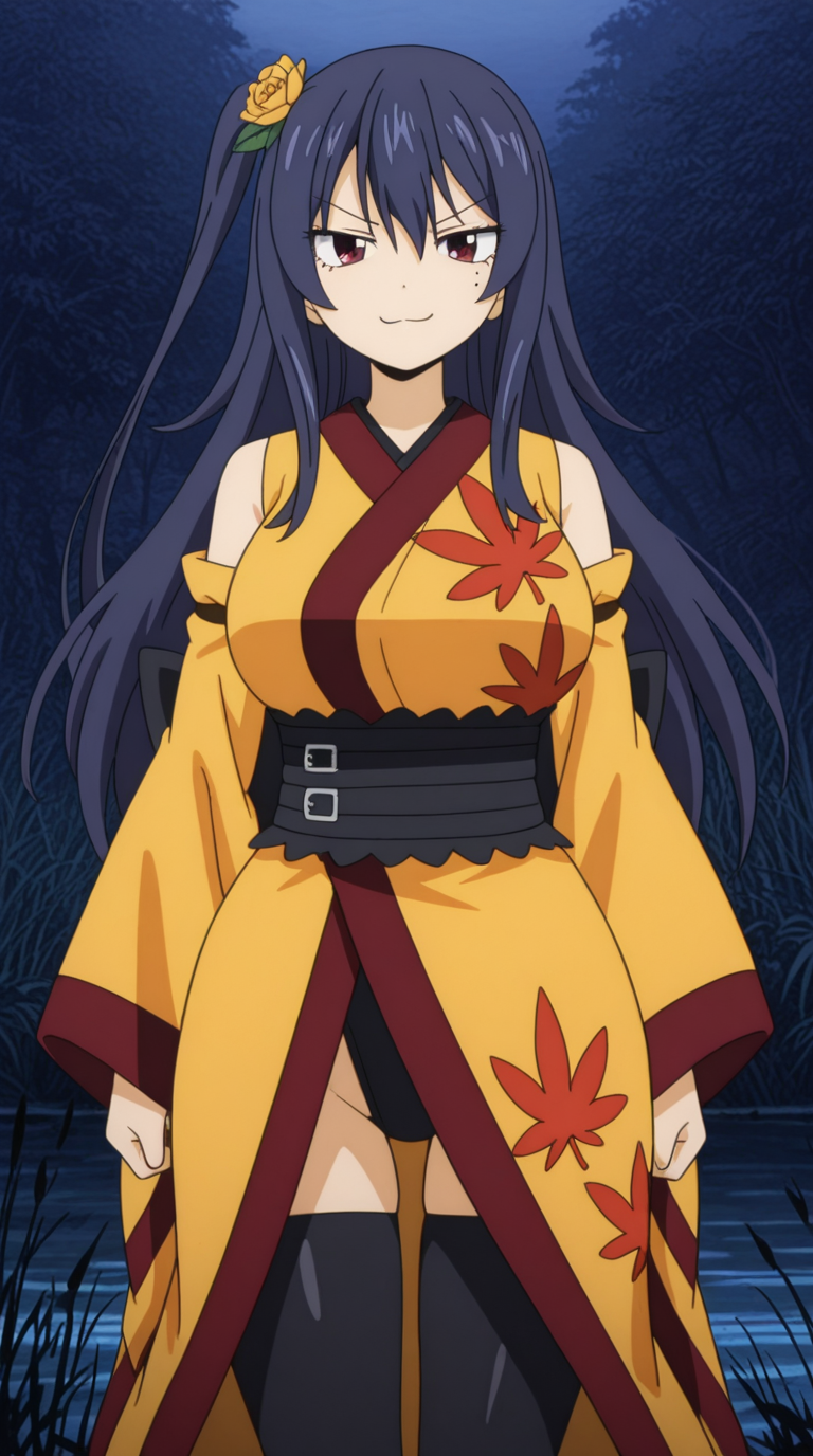 太ももハイソックス, 外側の袖, 日本の服, 黒い太ももハイソックス, 着物, 帯, オビ, 下駄, 葉のプリント, 黄色い着物,