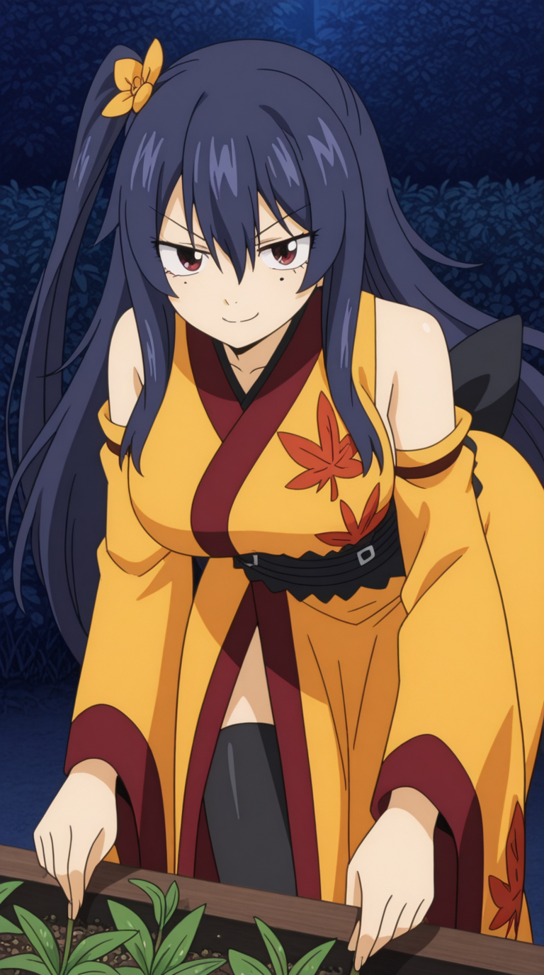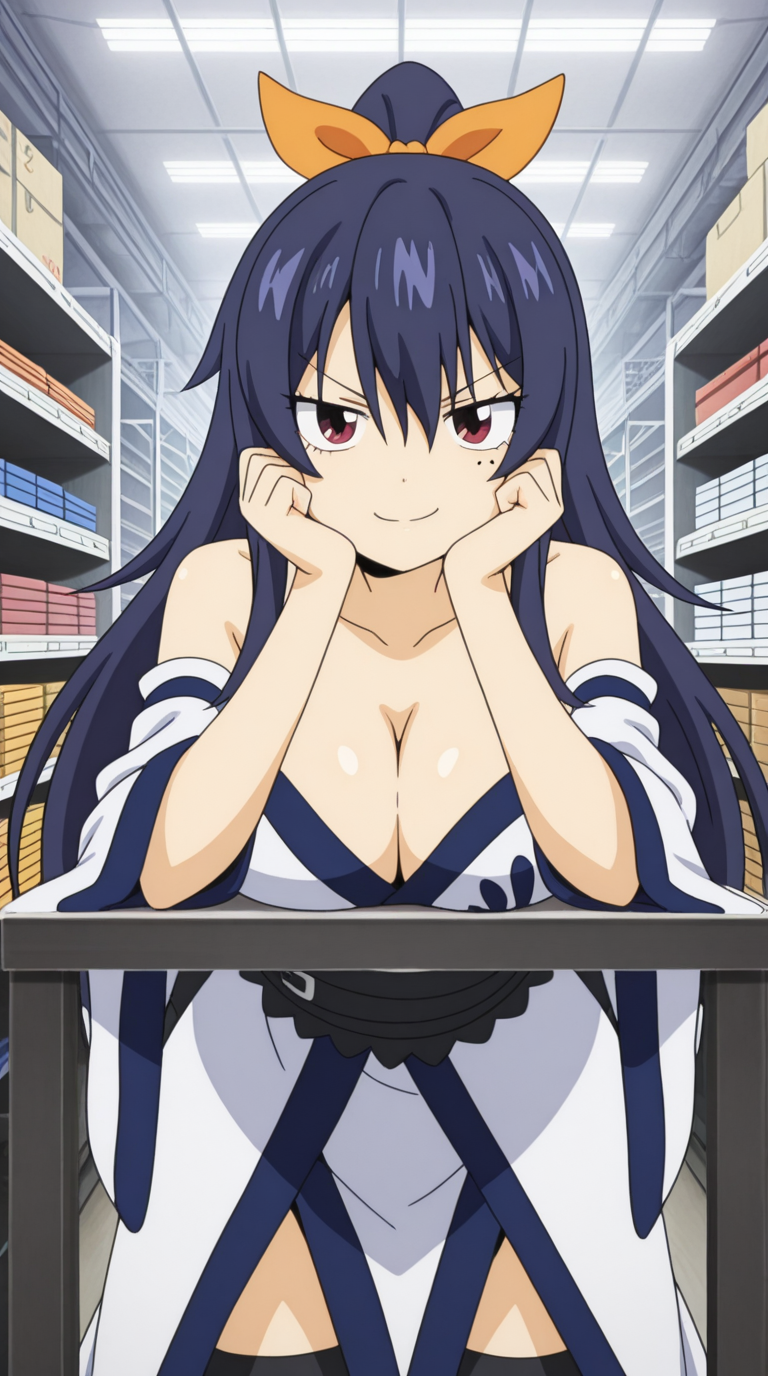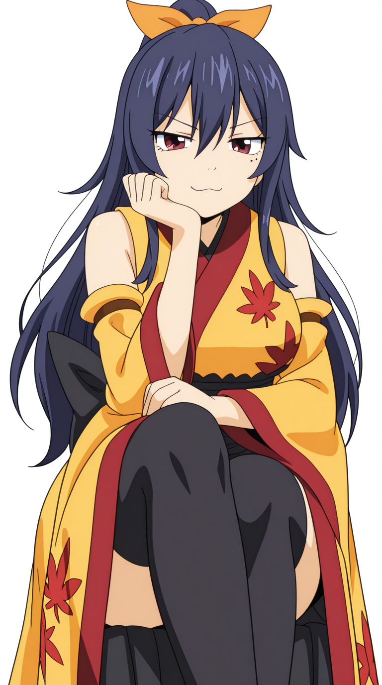 homura kougetsu, 長い髪, 青い髪, 赤い目, ほくろ, 目の下のほくろ, リボン, 髪のリボン, ポニーテール, オレンジのリボン, 成熟した女性, 大きな胸, アニメスクリーンキャプチャ
