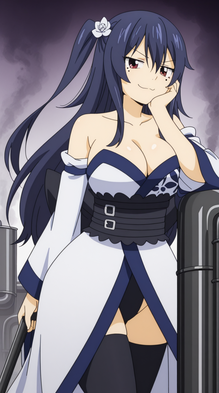 鎖骨, 肩を露出, 外側の袖, 胸元, 着物, 白い着物, オビ, 帯, 太ももハイソックス, 黒い太ももハイソックス, 青い縁取り, ブラジャーなし,