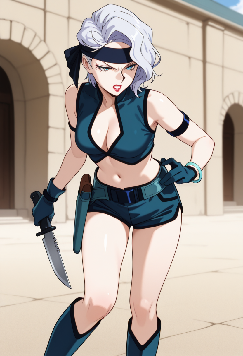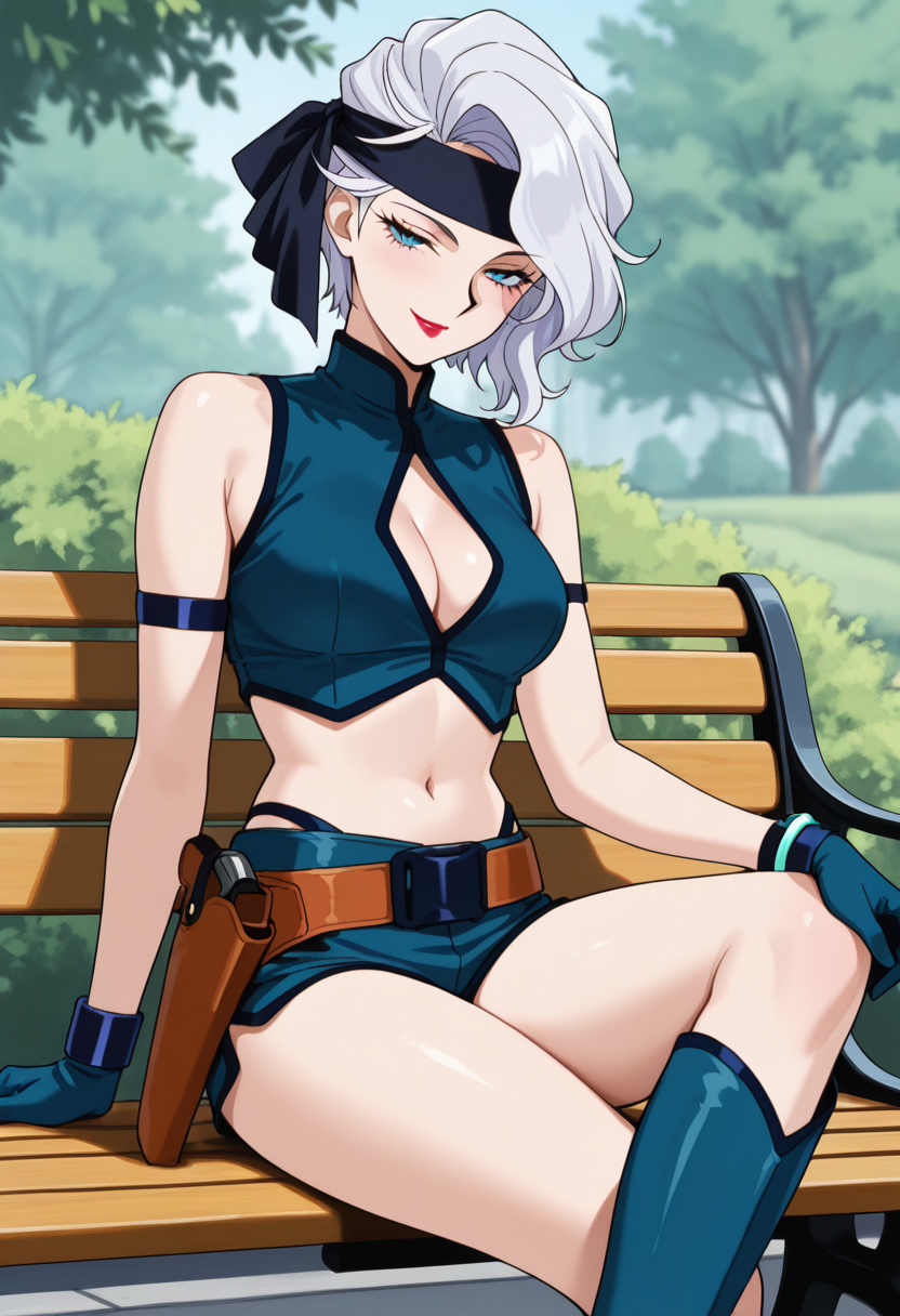 Iris3WA, 1girl, solo, white hair, wavy hair, short hair, eyelashes, blue eyes, lipstick, red lips, medium breast, curvy, large hips, black headband, bare shoulders, blue armband, blue bracelet, blue crop top, cleavage cutout, single blue glove, midriff, navel, gun holster, blue boots, knee boots, high heels,
