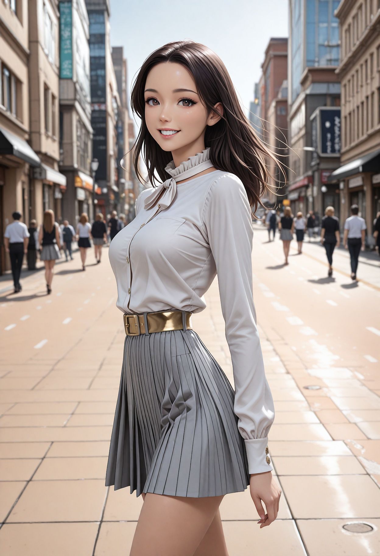 D088_미디 스커트, 흰색 주름 칼라 셔츠, 긴 소매 셔츠, 은색 긴 주름 미디 스커트, 실크 스커트, 골드 벨트,